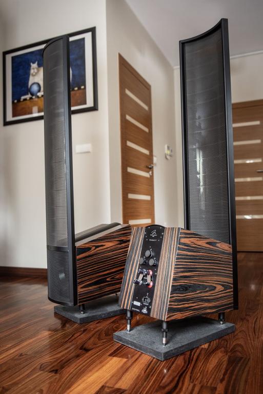 Speakers with 4 year old orginal Martin Logan panels (invoice avaliable) with custom Zebrano high gloss veneer. With additional granite stands. Absolutely flawless, almost like new.