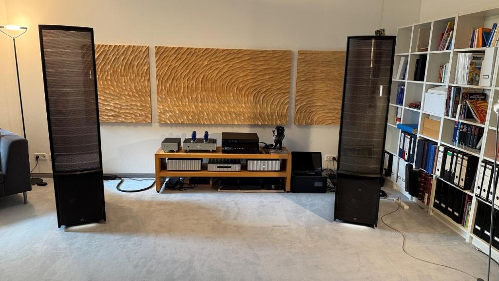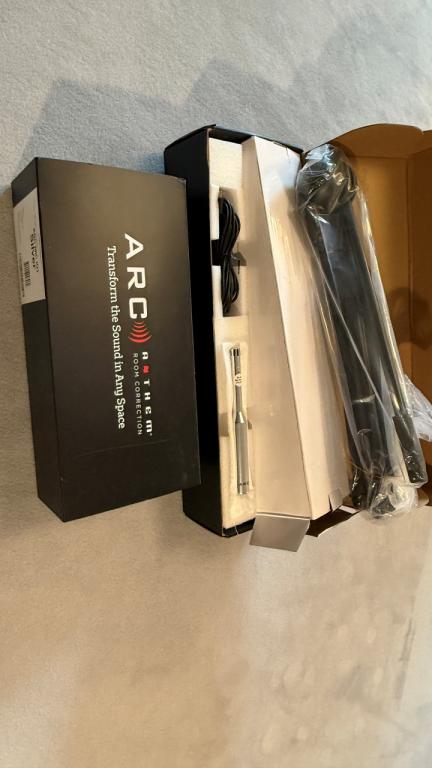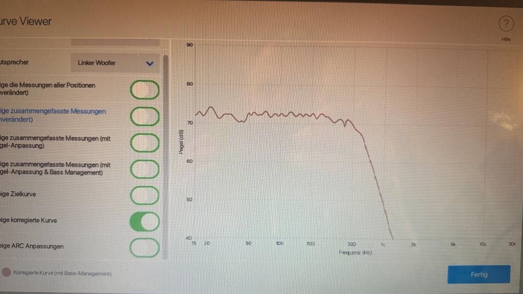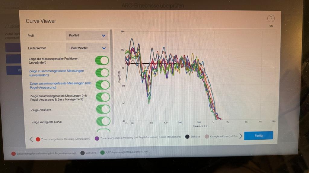Mit dabei ist das Anthem Room Correction Paket (ARC): Messmikrofon mit Stativ und Software. Damit lassen sich die Tieftöner der ESL 15a auf den Raum einmessen. Dies Software ist absolut selbsterklärend. Wie man an den Kurvenverläufen sieht, gelingt es damit in meinem Raum eine Resonanz bei 20Hz, eine Senke bei 45Hz und diverse Welligkeiten (10 Messpunkte/Kurven) auszugleichen. Das Ergebnis kann durch einen Kippschalter ARC On/Off sehr gut nachvollzogen werden. Darüber hinaus gibt es weitere Anpassungsmöglichkeiten im Bass.