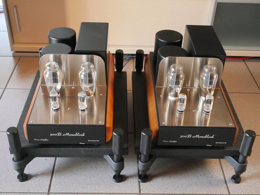 ... biete hier die großen Monoblocks von Mastersound an; 300B Parallel Single Ended, Class A, 24 Watt, die Monoblocks spielen einwandfrei und voll alltagstauglich, die Ruhestromeinstellung ist sehr einfach, so dass man auch mit verschiedenen Endröhren probieren kann... 2-fach Röhrenbestückung beim Verkauf: JJ 300B (neuwertig) und MeshPlate 300B von Shuguang (nagelneu von BTB), die Monos sind sehr sauber und nikotinfrei, die abgebildeten - sehr hochwertigen und höhenverstellbaren - Gerätebasen sind separat zu erwerben zum Preis von EUR 850,00 (NP. EUR 2.500,00). Probelauf ist bei ernsthaftem Kaufinteresse natürlich möglich, kein Versand - nur Abholung. Es handelt sich um einen Privatverkauf ohne Gewährleistung oder Rücknahme, unter Ausschluss jeglicher Sachmängelhaftung. Ein Paletten-Versand per Spedition wäre nach Absprache möglich