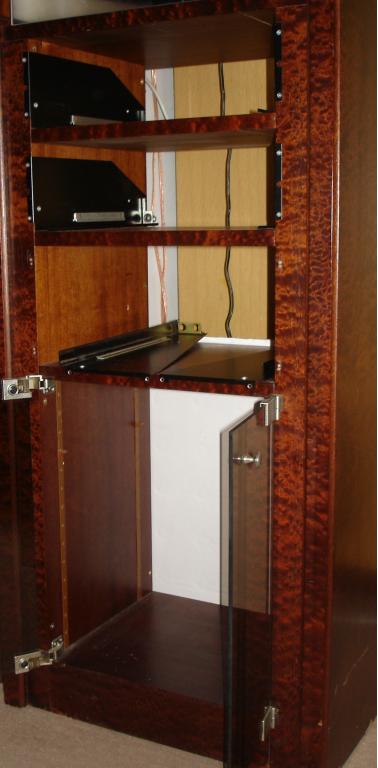 4. Rack eines Schreiners (Makassar-Furnier, mit leichten Schrammen im unteren Seitenbereich) Die Fotos zeigen das Rack mit und ohne den McIntosh-Geräten. Die Panlock-Schienen für C28, MR77 und MC2105 sind im letzten Foto zu erkennen. Die 3 Panlock-Schienen kosten mit dem Rack 150 Euro.