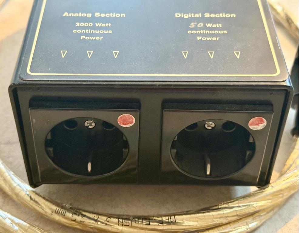 Ausgänge: 1 x Schukosteckdose für analoge Geräte (3600 W) (Endstufen, Vorstufen, ...) 1 x Schukosteckdose für digitale Geräte (1200 W) (CD, DVD, DAC, ...) gekennzeichnete Phase