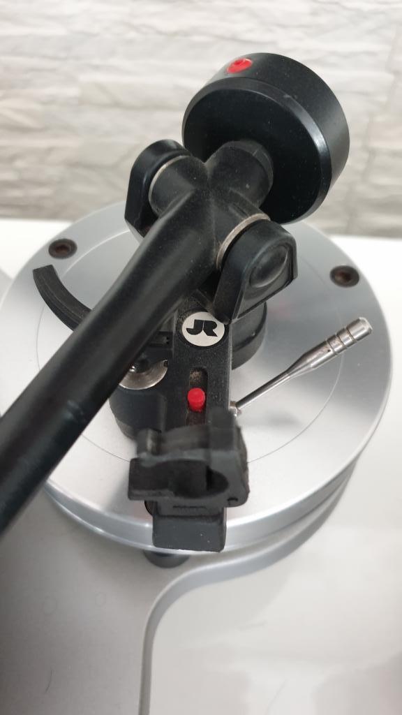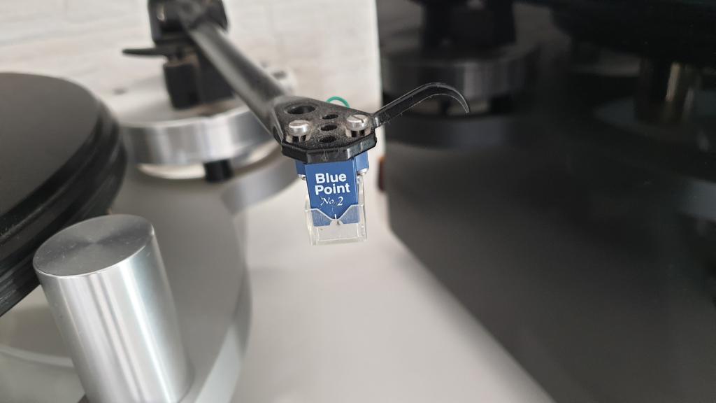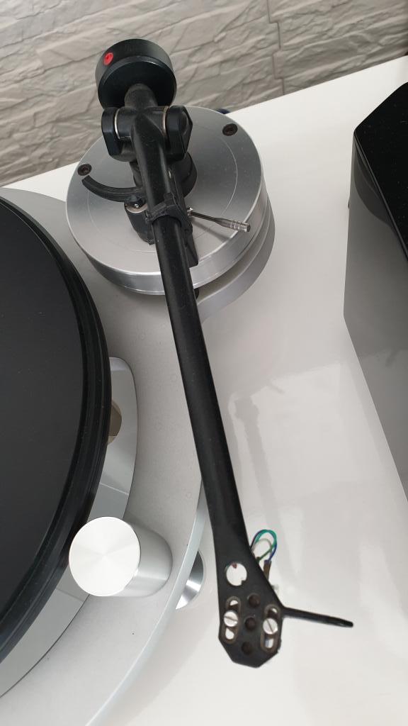Der Tonabnehmer ist ein High-Output MC System der Marke Sumiko und zwar das Model Blue Point No.2 (damals ca. 500 Euro). Dieses System spielt ohne Probleme an jedem üblichen Phonoanschluss. Da ich immer alle Platten nass abgespielt habe, sollte sich der Verschleiß der Nadel sehr in Grenzen gehalten haben. Vor fünf Jahren habe ich jedenfalls als Test ein Nachfolgemodel des Tonabnehmers installiert, aber da ich keinen Unterschied zum alten Abnehmer hören konnte, wurde das neue Teil wieder zurückgeschickt.