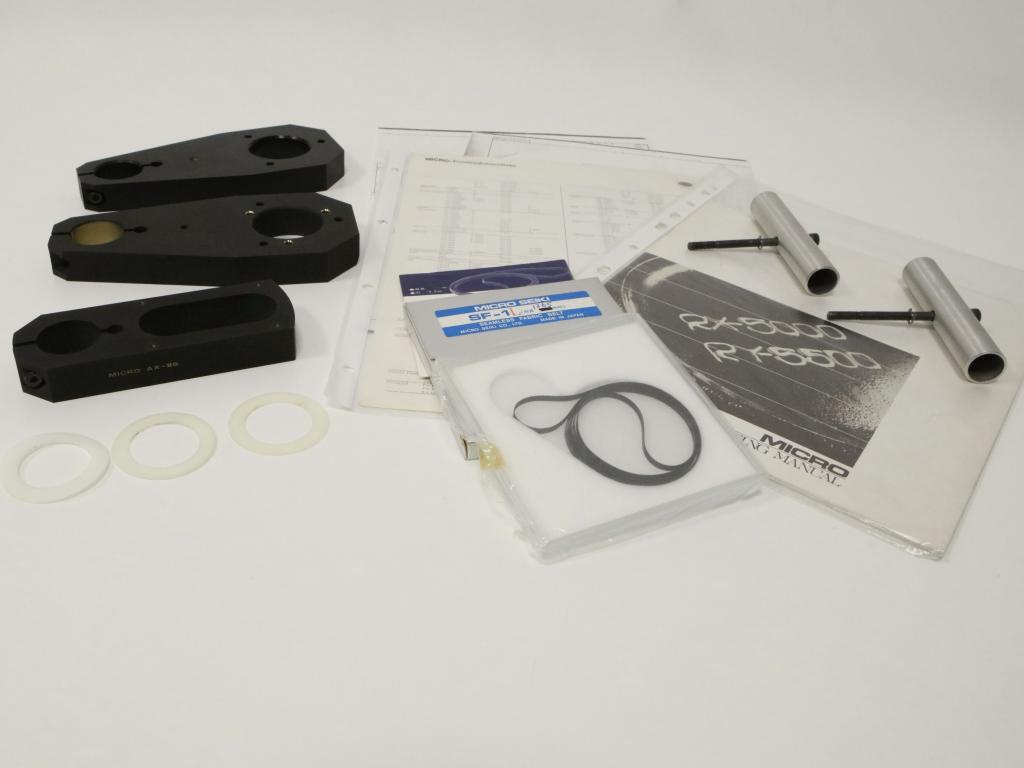 Zubehör: 1 Micro Seiki AX 2G+ 2x Base für Technics Tonarme, SF1 Riemen, Werkzeug zum Teller abnehmen, Schaltplan, SELTEN Bedienungsanleitung englisch und original