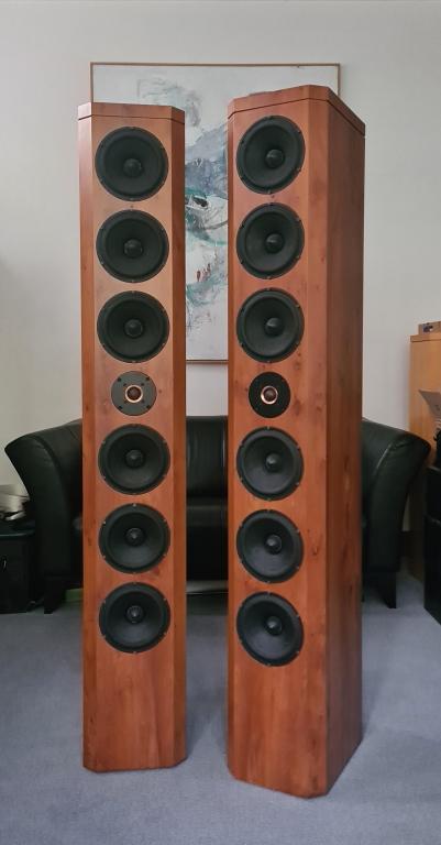 Die Lautsprecher sind in Eibe Holzfurnier, welches über die Jahre gleichmäßig nachgedunkelt ist.