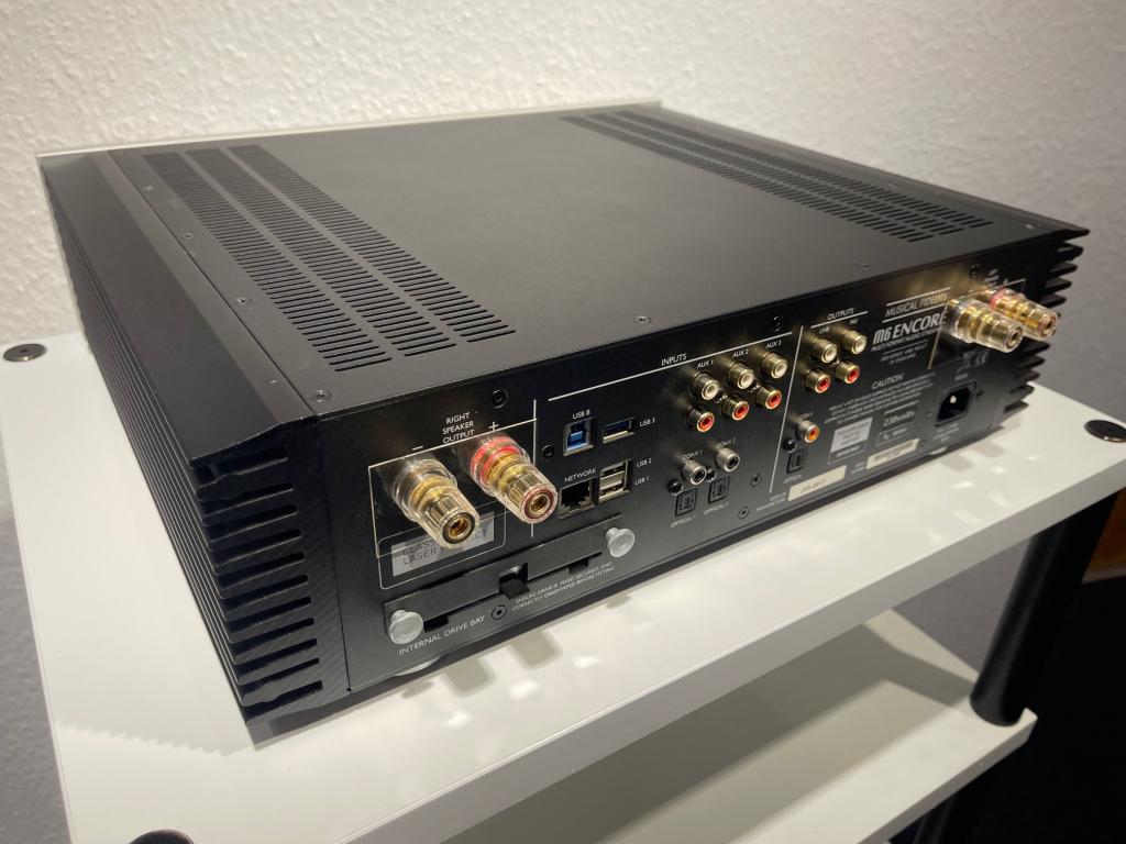 Musical Fidelity M6 Encore 225 integrierter Streaming-Audio-Player mit 2x225 Watt Vollverstärker und 2TB-Festplatte und neuem externem WiiM Pro High-Res-Streamer mit Multiroom, Wifi, AirPlay 2, Audio Pro App, Spotify und Tidal Connect.