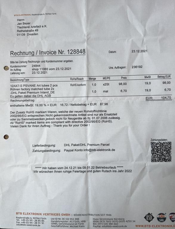 Ich habe das Gerät Ende 2020 beim Hifistudio Falkensee gebraucht erworben, daher gibt es auch keine Originalrechnung. Ein Röhrensatz von PSVANE ist inklusive, die Original Mullard funktionieren auch noch tadellos. Klanglich jederzeit überzeugend mit einem Paar Audeze LCD-XS gehört. Abgabe aufgrund von Wechsel auf einen anderen Kopfhörerverstärker. Gebrauchsspuren konnte ich keine finden, daher optisch neuwertig. Zusendung weiterer Bilder gerne auf Anfrage, Versand problemlos da Originalverpackung vorhanden.