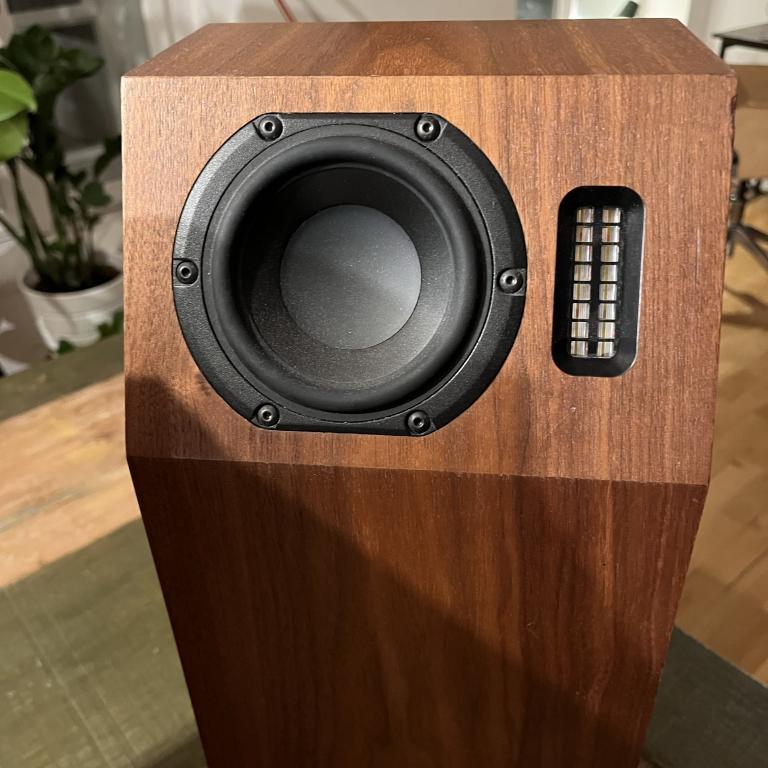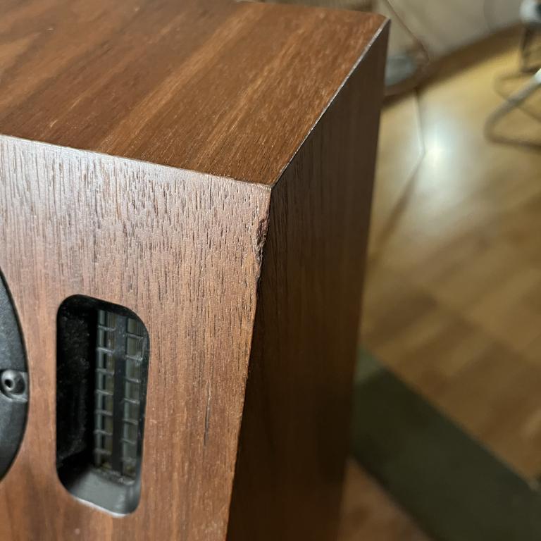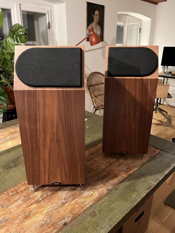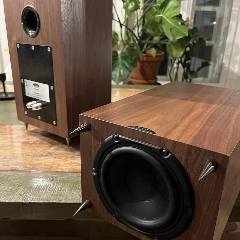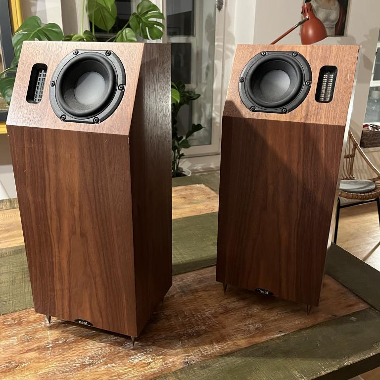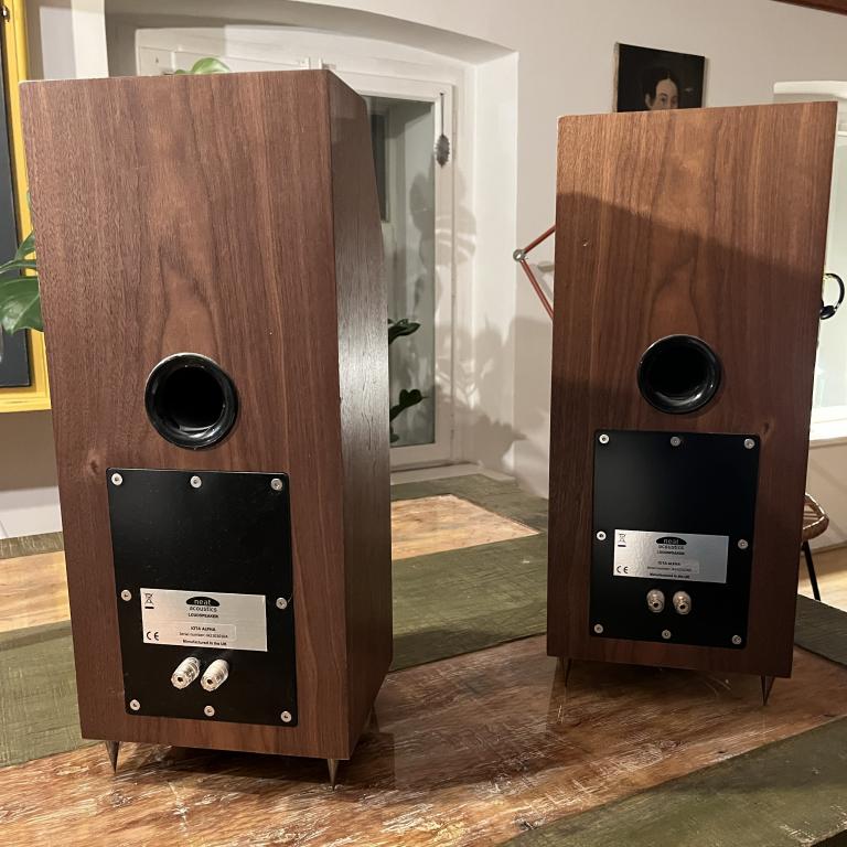 Iota Alpha in walnut with black covers. Originally conceived speakers that offer a classic, honest British sound. Moreover, they play bolder, fuller and deeper than their dimensions would promise.