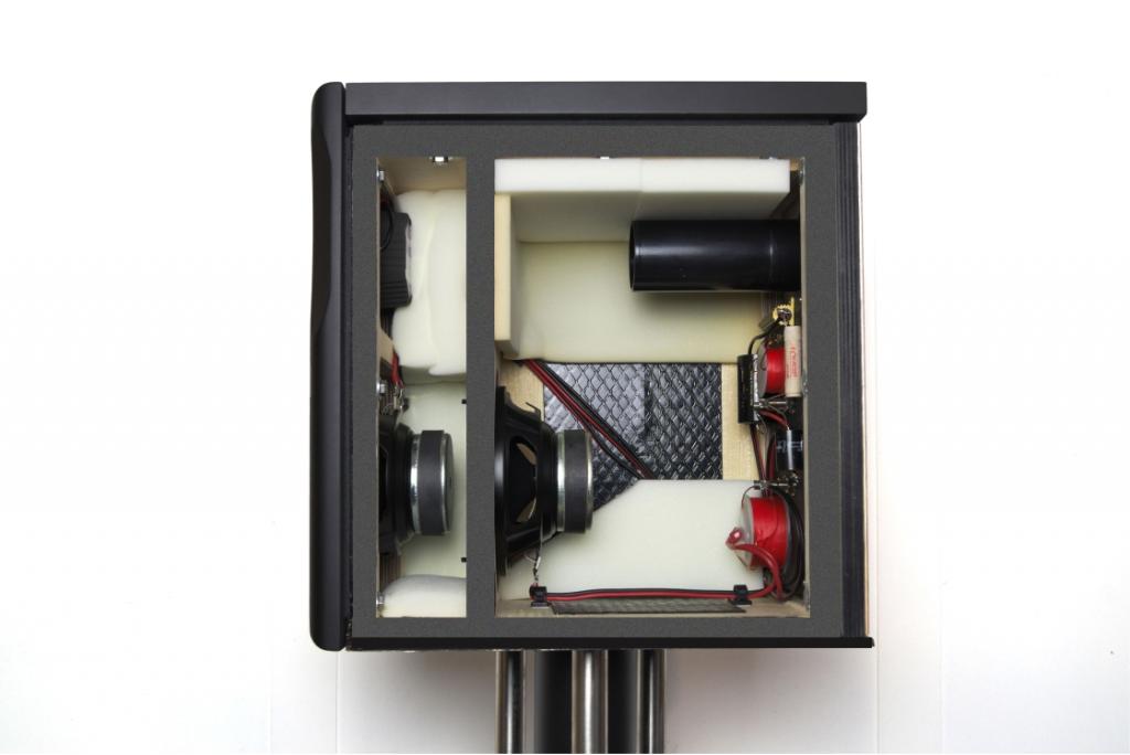 Das Gehäuse umfasst vier getrennte innere Hohlräume, die jeweils für einen bestimmten Zweck optimiert sind. Die Mid / Bass-Abstimmung ist optimal für die Lautstärke des Hauptgehäuses, während das HF-Gehäuse klein ist, um die Steifigkeit zu erhöhen und den Gegendruck des Mid-Bass-Treibers zu stoppen, der die hintere Kammer des Hochtöners beeinträchtigt. Die beiden EMIT-Hochtöner sind ähnlich isoliert.