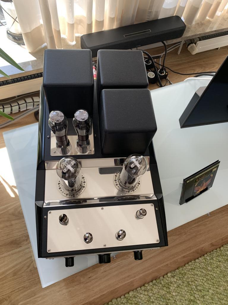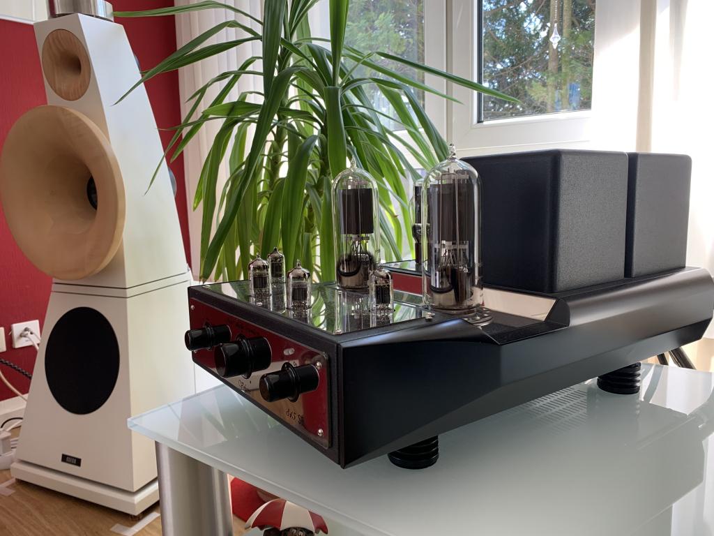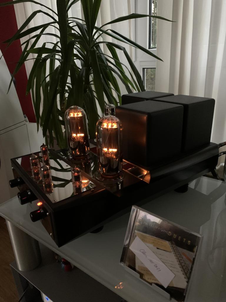 Dieser Single Ended Verstärker musiziert sehr dynamisch, sanft und klar mit kontrolliertem Bass….Also ein schönes Analoges Klangbild mit großflächiger Abbildung.
