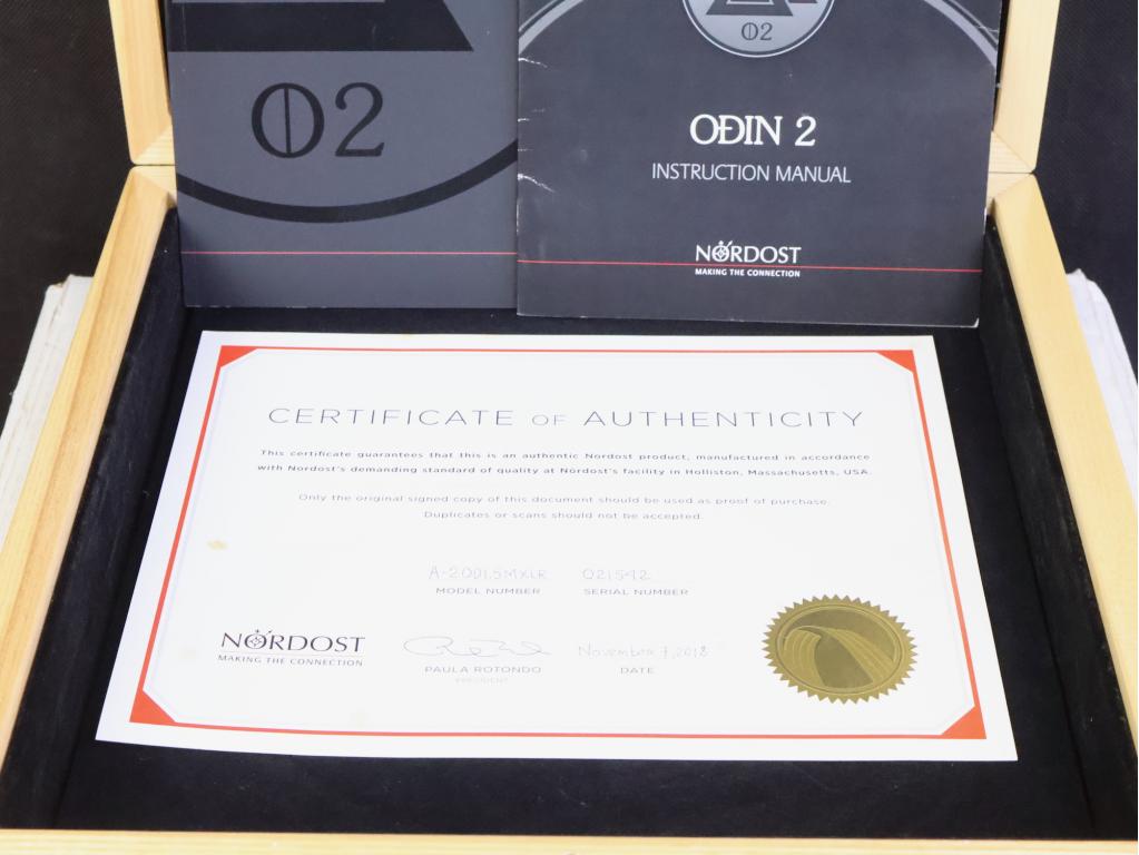 One pair of Nordost Odin 2 Supreme Reference high end audio interconnect cables in a fantastic condition. The length is 1,5 metre and they have the original Nordost HOLO:PLUG XLR connectors. Serial number is O21542. Retail price is 38.790 euro (current German price list). The original wooden box, outer box, certificate and booklets are included. Check our other listings for more interesting items. Free shipping worldwide!