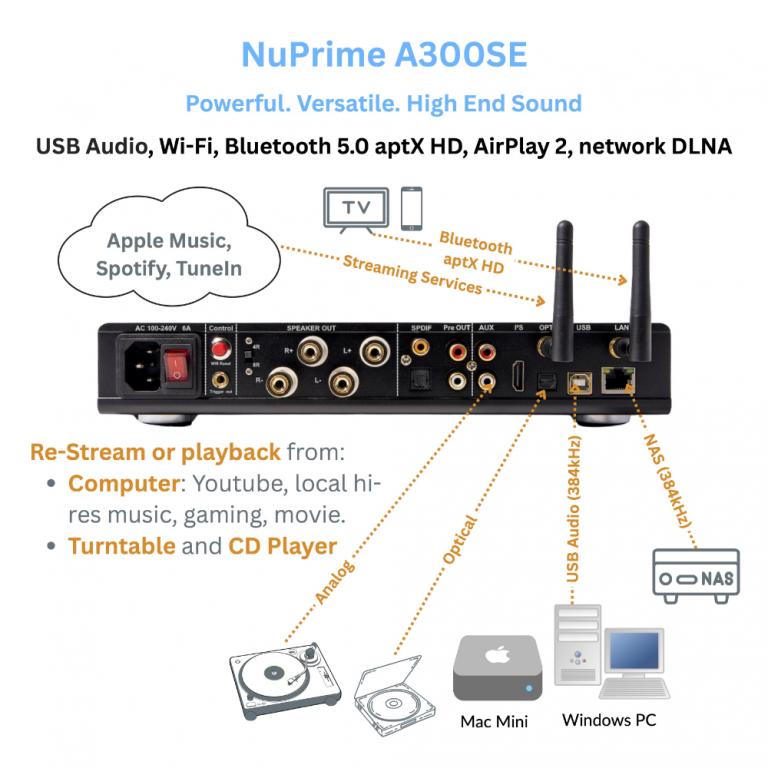 NuPrime Omnia A300SE is a full-featured multi-room streaming integrated amplifier (2 x 150W @ 8 ohms; 2 x 200W @ 4 ohms) capable of Wi-Fi 24-bit/192kHz and Bluetooth 5.0 aptX HD streaming. The Omnia A300SE includes multiple digital and analog inputs, with up to USB 24-bit/384kHz and DSD256 decoding. The A300SE supports all major online streaming services, Bluetooth 5.0 (aptX HD). AirPlay 2, and network DLNA streaming.
