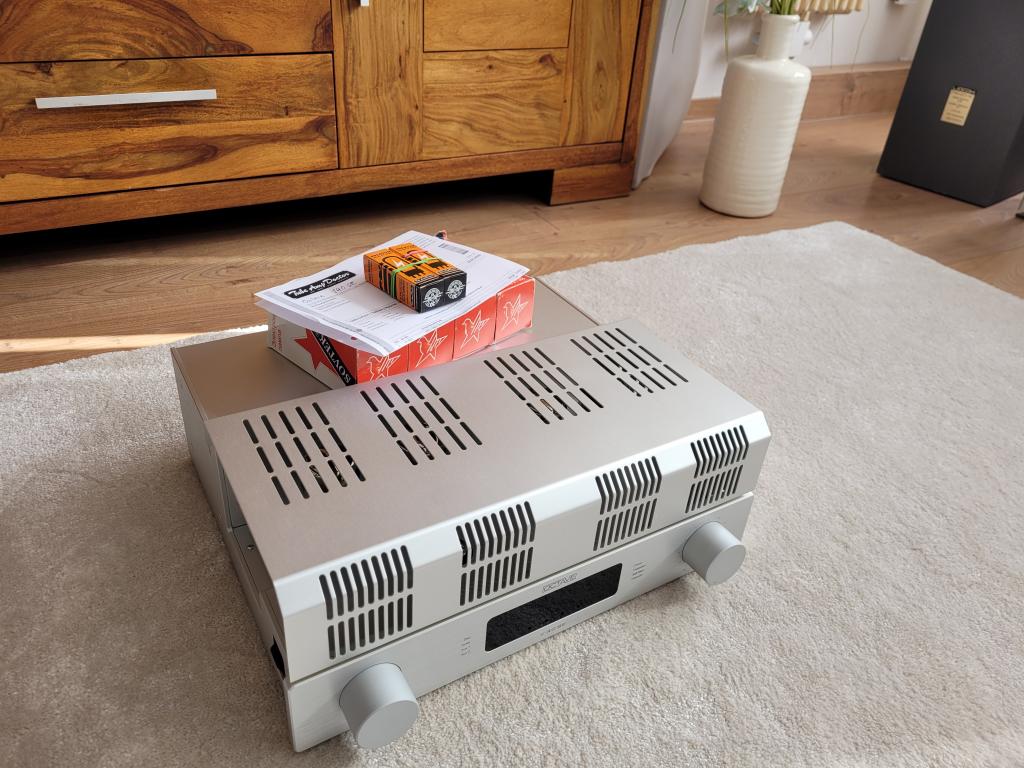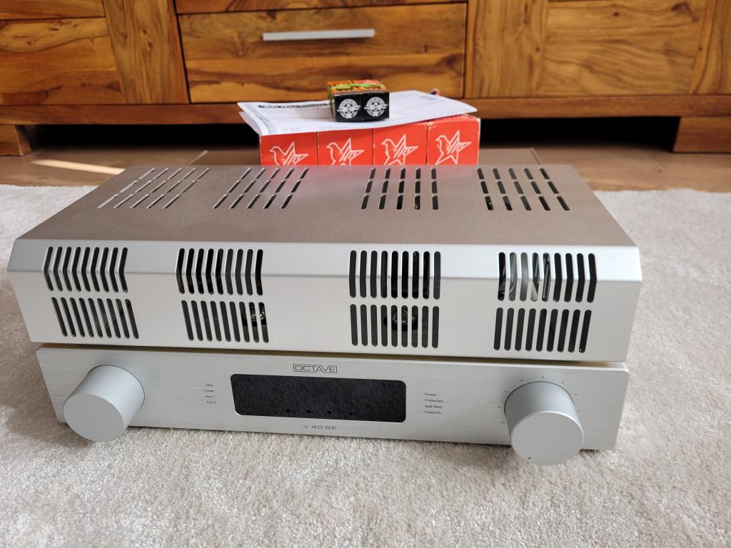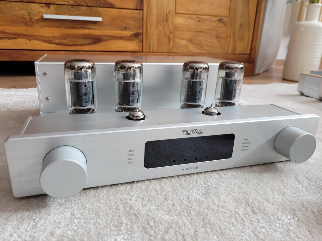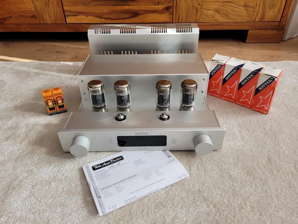 Auflösung der Zweitanlage, beliebter Vollverstärker von Octave mit zweitem Röhrensatz von T.A.D. beide 6550 von Sovtek. Laufen beide einwandfrei, neue Vorstufen Röhren von T.A. D. im Januar erneuert und mit ca. 20 Stunden gerade eingespielt. Läuft mit diversen anderen Röhrentypen z.B. KT 88 etc. Details bitte aus dem Netz entnehmen.