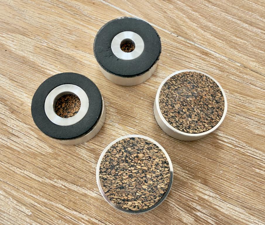 Weiterhin werden spezielle Absorber Gerätefüße aus der 4TUBE Serie der Fa. bfly-audio mitgeliefert. Sie sind speziell konstruiert für Röhrengeräte mit unterschiedicher Gewichtsverteilung, wie z.B. dem Trafo im hinteren Teil des Verstärkers.