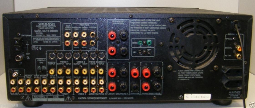 Artikel :Onkyo Integra TX-DS838 Black Zustand: Gerät ist in einem sehr gutem Zustand !Technische DatenDolby Digital (AC-3)Dolby Pro Logic volldigitalD/A- und A/D-WandlerLucasfilm Cinema Re-EQEinstellbares Digital DelayMidnight Theater-ModusMotorola DSP: 56004 + 56009Surround-Einstellungen: 12Digitaleingänge: 1 x optisch, 1 x koaxial, 1 AC-3 RFAudio- und AV-Eingänge: 4 / 4 (Front-AV-Eingang)Front-Kanal-VorverstärkerausgängeSurround-Kanal-VorverstärkerausgängeSubwoofer-VorverstärkerausgangPhono-EingangKopfhörerausgangMultisouce (Vorverstärkerausgang)IPM (Intelligent Power Management System)PAL/NTSC-kompatible BildschirmanzeigePunktmatrix-DisplayDimmbares Display: 4 StufenAnzahl der Stationsspeicher: 40Gruppeneinteilung (nur Receiver): 4 GruppenFrequenzdirekteingabe (nur Receiver)RDS (nur Receiver)Dämpfungsfaktor: 60Non-NFB-Topologie: (Front-Kan.)Niederimpedante AusgängeDiskret aufgebaute Endstufen540 Watt Sinusleistung im Surround: 3x 140 Watt (2x Front; 1x Center); 2x 60 Watt (Rear)Dynamische Leistung in Stereo : 2x 220 Watt