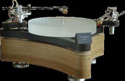 Hier wurde das Droplet Prinzip, maximale Festigkeit mit hoher Dämpfung durch eine Kombination aus Luftfederung und Sandwichbauweise auf die Spitze getrieben. Dabei ist gleichzeitig ein Design entstanden was auch Richard Wagner persönlich begeistert hätte. Auf das Laufwerk können 3 Tonarme ohne die Montage zusätzlicher Ausleger montiert werden. Sowohl die hervorragenden hauseigenen Tonarme, als auch jegliche SME, Rega, Ortofon Tonarme können problemlos montiert werden.