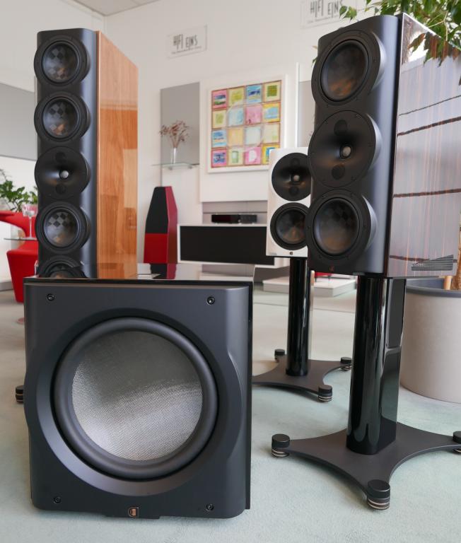 In der Ausstellung vorhanden: S4b Hochglanz Weiß inklusive Lautsprecherständer, D212s Subwoofer Hochglanz Schwarz