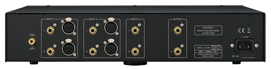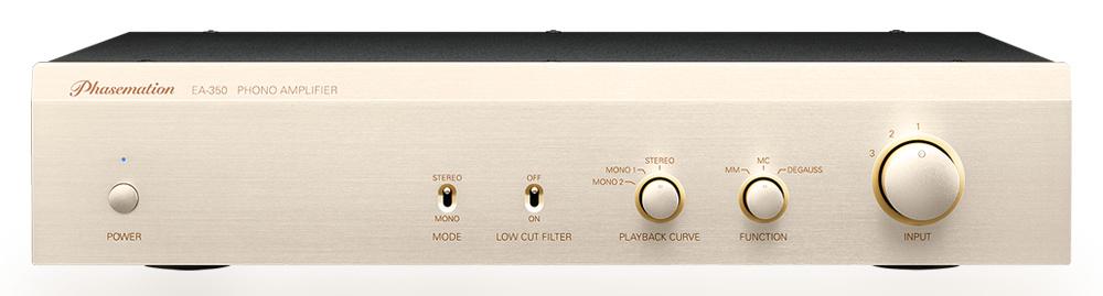 Es sind drei Eingänge vorhanden, für die jeweils eine MM/MC-Umschaltung möglich ist. Darüber hinaus haben die Eingänge 1 und 2 parallel noch symmetrische Anschlüsse. Phasemation hat erkannt, dass eine zusätzliche Verstärkung für MC klanglich nachteilig ist. Daher wird nicht nur in den Röhrengeräten (EA-1200 und EA-2000), sondern auch schon in der EA-350 ein Übertrager eingesetzt. In der EA-350 ist für den MC Eingang ein modifizierter T-320 Übertrager integriert.