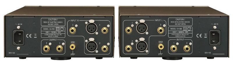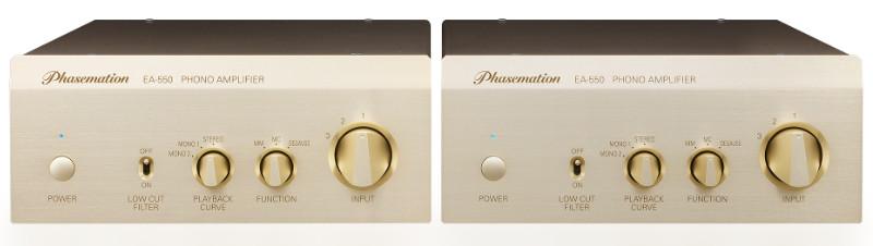 Es sind drei Eingänge vorhanden, für die jeweils eine MM/MC-Umschaltung möglich ist. Darüber hinaus haben die Eingänge 1 und 2 parallel noch symmetrische Anschlüsse. Phasemation hat erkannt, dass eine zusätzliche Verstärkung für MC klanglich nachteilig ist. Daher wird nicht nur in den Röhrengeräten (EA-1200 und EA-2000), sondern auch schon in den Transistorgeräten ein Übertrager eingesetzt. In der EA-550 ist für den MC Eingang der T-550 Übertrager integriert.