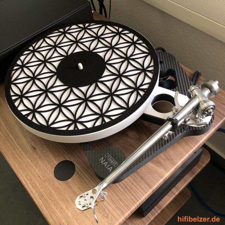 Denn diese Prototypen waren ohne Muster, also komplett durchgängige Ledermatten. Um die Auflagefläche der LP zu reduzieren, hat man sich bei Phonosophie für eine geometrische Figur entschieden, die man auch als "Blume des Lebens" kennt.