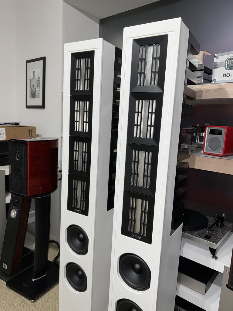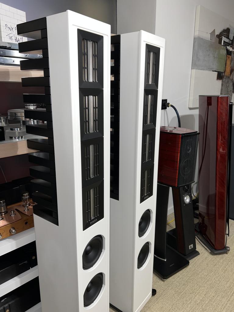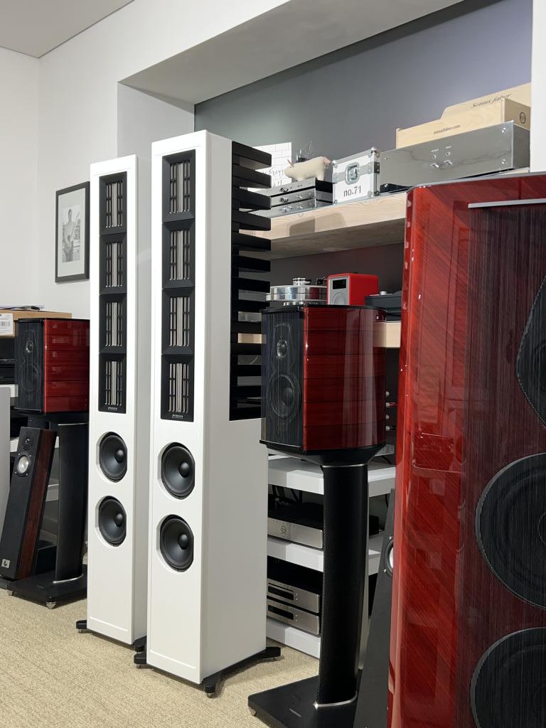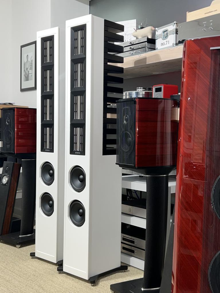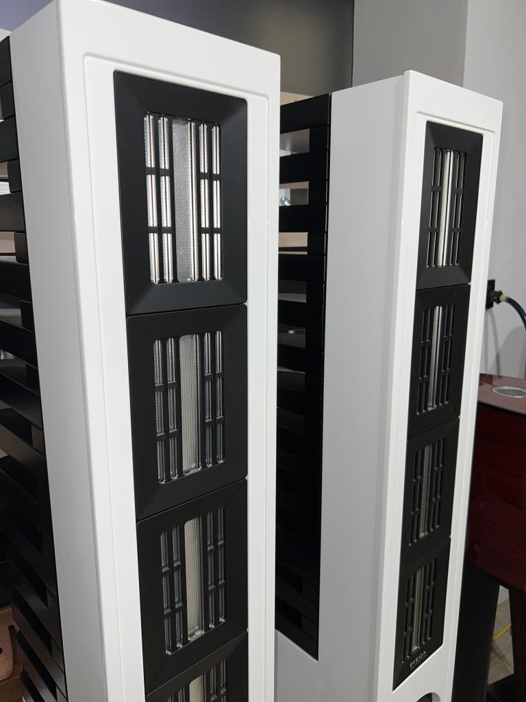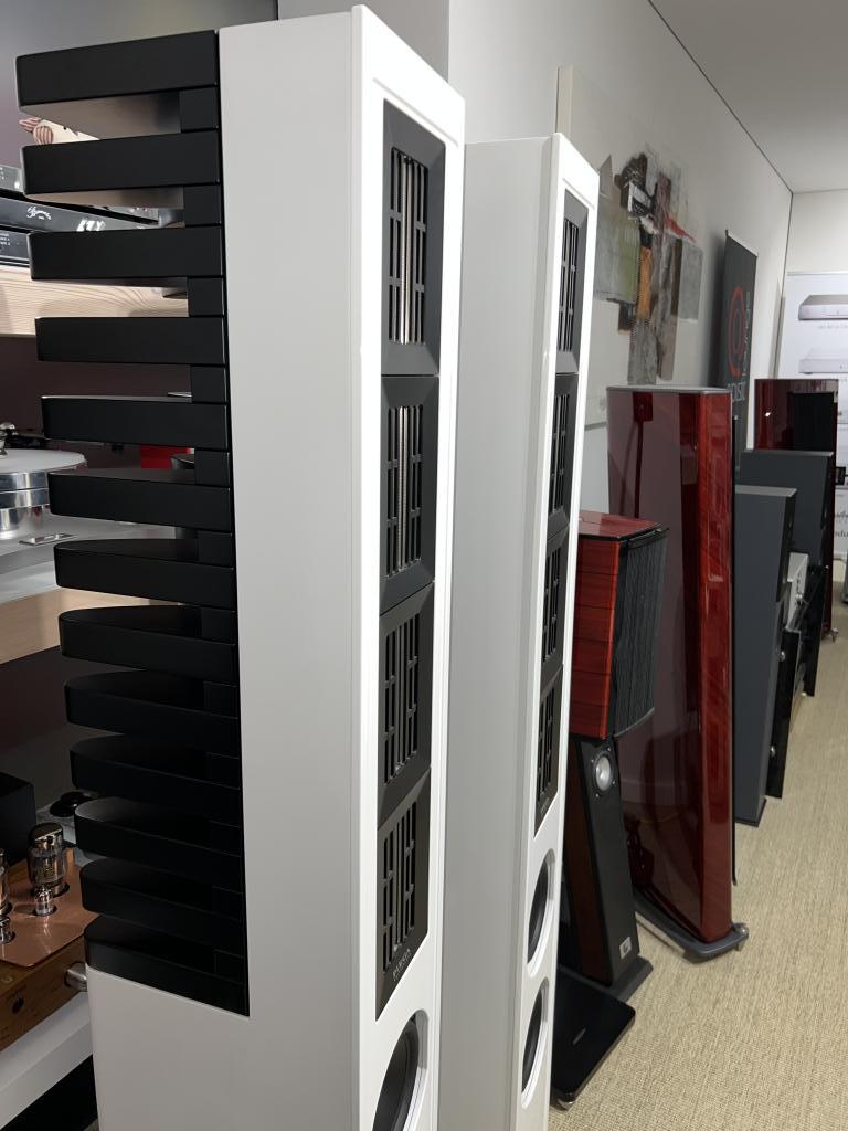 - Schallwand weiss, Gehäuse weiss Hochglanz lackiert, Abdeckung Stoff weiss oder schwarz.