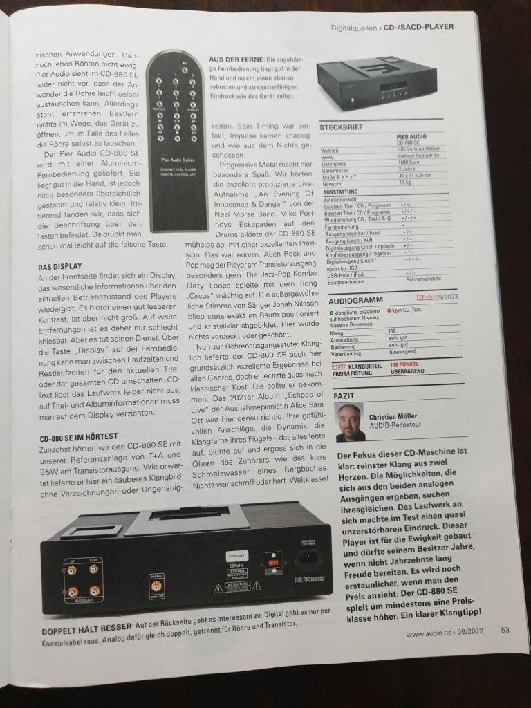 "Der Focus dieser CD-Maschine ist klar: REINSTER Klang aus zwei Herzen. Die Möglichkeiten, die sich aus den beiden analogen Ausgängen ergeben, suchen ihresgleichen. Das Laufwerk macht einen unzerstörbaren Eindruck. Dieser Player ist für die Ewigkeit gebaut! Der CD 880 SE für 1800 Euro spielt um mindestens eine Preisklasse höher. Ein klarer Klangtipp! "