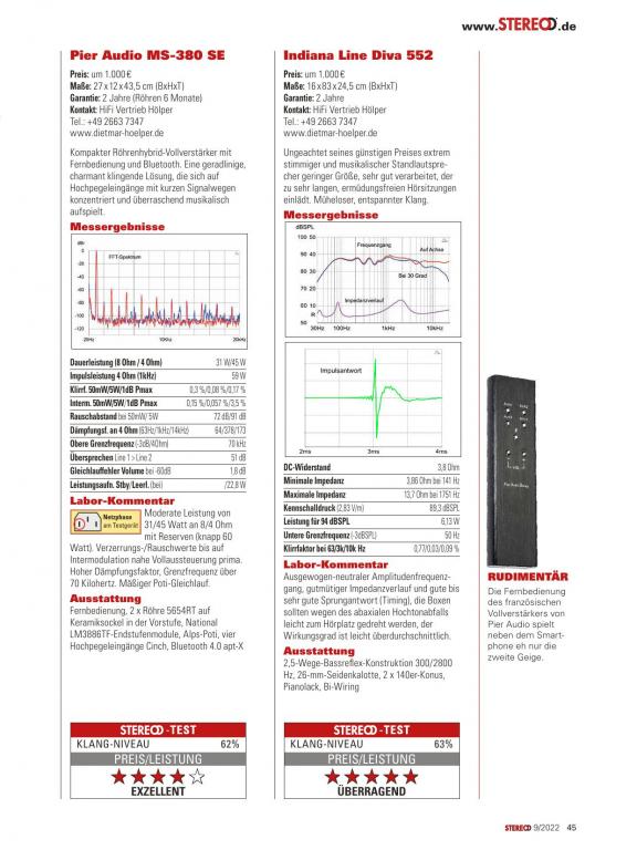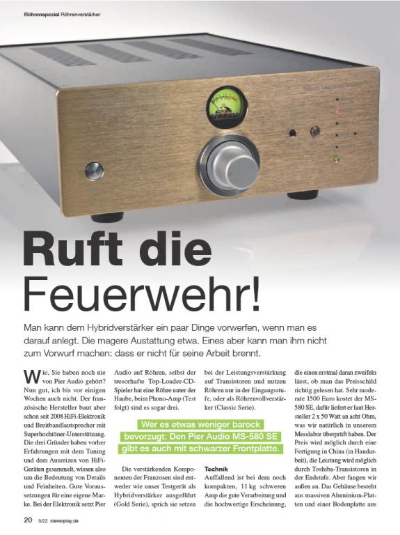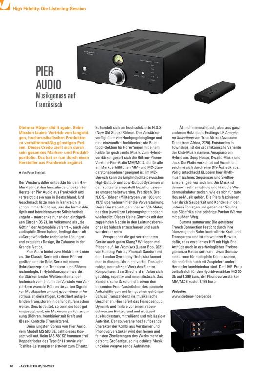 Die Musikerzeitschrift JAZZTHETIK ist ebenfalls von Dynamik, Timbre und einer ausdruckstarken, mitreißenden lässigen Autorität des MS 580 SE fasziniert, die auch in Kombination mit der passenden Phonovorstufe von PIER AUDIO auftritt. Erhöhte Siebkapazität, ausgesuchte Netzteil- und Signalkondensatoren sowie seleketierte Vorstufenröhren aus alten Beständen (N.O.S.) sind hier eindeutige Hinweise auf qualitätsbewußte Fertigung.