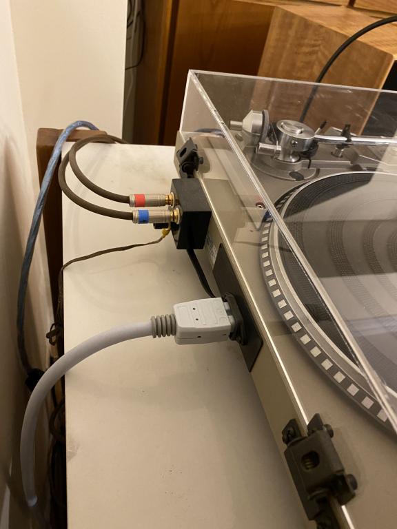 Dust cover (not sure if it is the original), and has two modifications, pone that can accept regular IEC power cable and RCA female sockets so you can use your own interconnect cable.