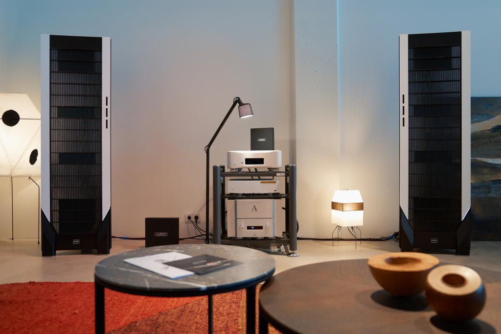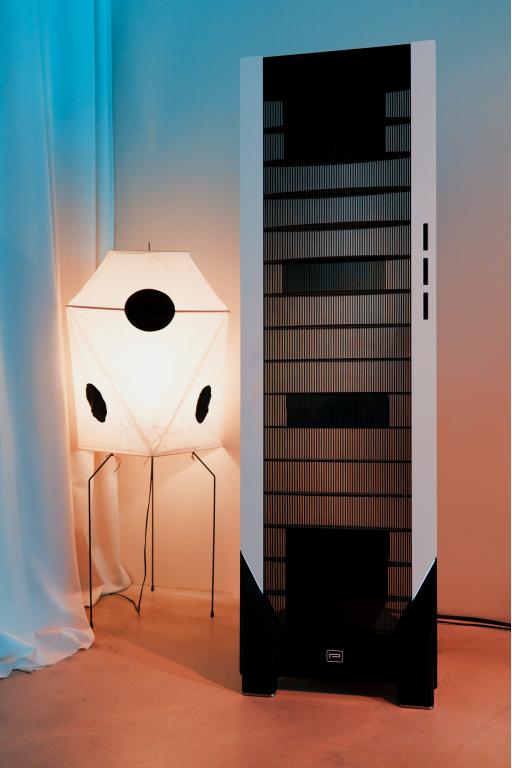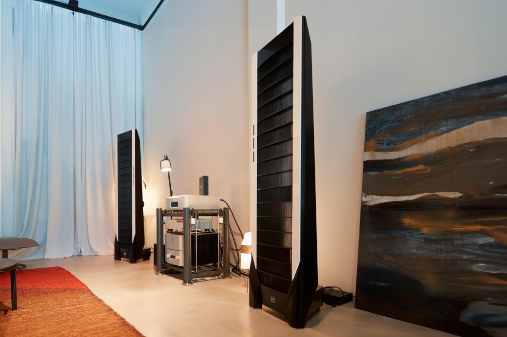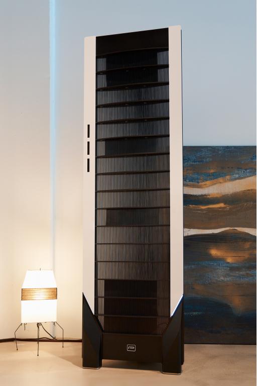 Wide range two-way electrostatic speaker with ribbon high frequency planar transducer.