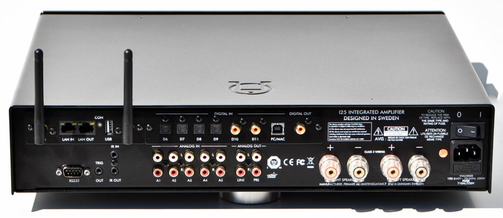 The Primare I25 Prisma offers unbalanced (RCA) analogue Inputs, optical + coaxial S/PDIF Digital Inputs, 1x coaxial Digital Output, Bluetooth, 2x LAN connection (RJ45), WiFi, USB-A + USB-B, a stereo Preamplifier + Tape Output, one pair gold-plated, fully isolated Speaker Output Terminals, supports Streaming Services like Tidal, Qobuz, Spotify. Controlled by PRIMARE Prisma App, PRIMARE C25 System-RC included.