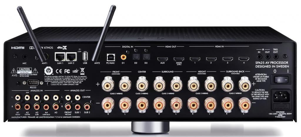 Die Ausstattung des SPA25 Prisma umfasst vier HDMI 2.0b Ein- + zwei HDMI 2.0b Ausgänge, fünf Cinch Stereo Eingänge, fünf Cinch Ausgänge, insgesamt fünf Digitaleingänge (2x optisch, 1x koaxial, je 1x USB-A und USB-B), Bluetooth, 2x LAN und WLAN. Dirac Live Raumeinmessung. Die Steuerung erfolgt komfortabel über die beiliegende PRIMARE Prisma Fernbedienung, die kostenlose PRIMARE PRISMA App steuert den integrierten Netzwerkspieler. Zur Einrichtung des WLAN und Steuerung des Google Chromecast built-in Moduls ist ein Google Home Konto und eine gmail email Adresse erforderlich – beides kostenlos.
