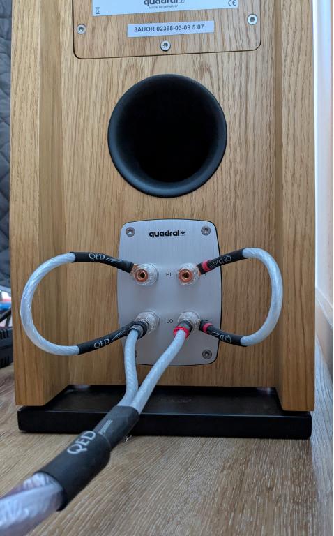 Alternativ stehen zur Verfügung auch die weiterhin beschriebenen QED Genesis Silver Spiral Lautsprecher-Kabel, noch nicht mal 1 Jahr alt, plus die passenden original Kabelbrücken für einen zusätzlichen Preis von 350€. Die Kabel haben eine Länge von 2 x 2m und passen akustisch und optisch hervorragend zu den Lautsprechern, wie auf den Fotos auch gut ersichtlich ist.