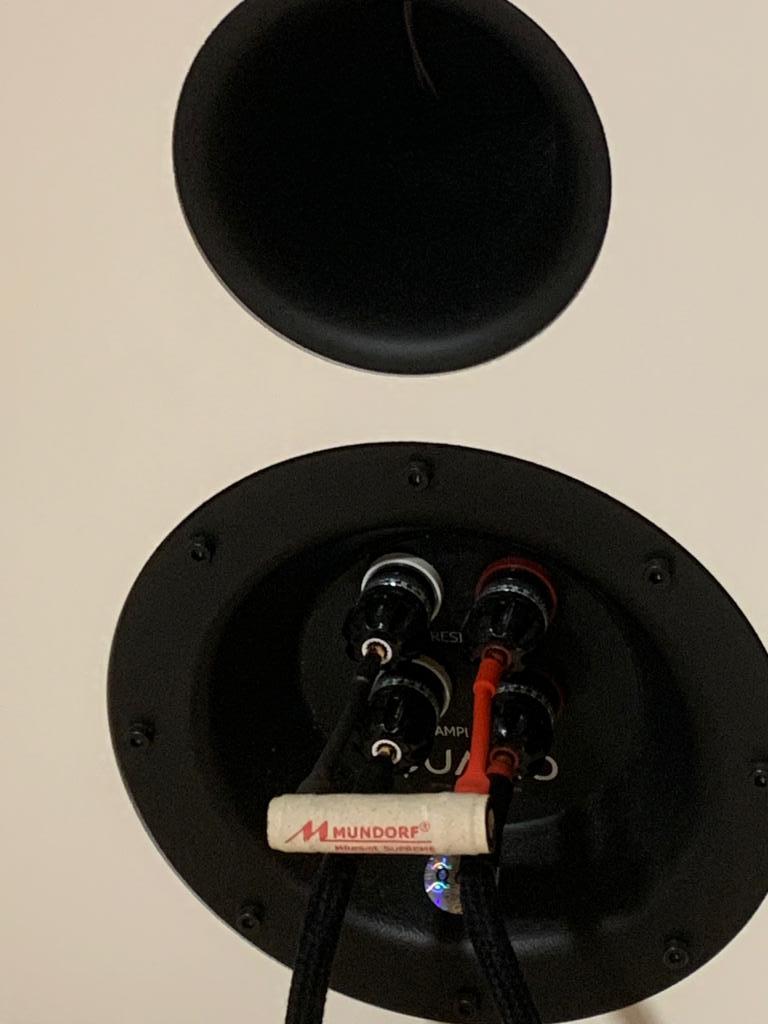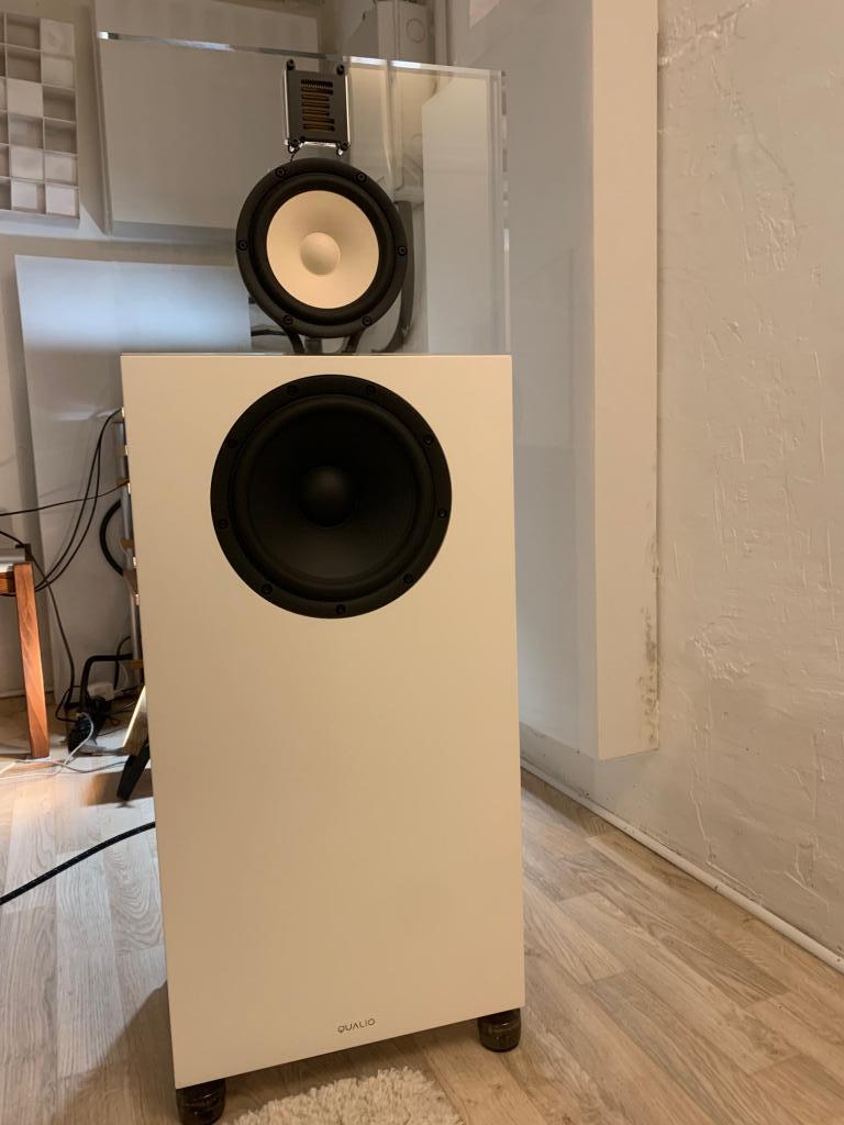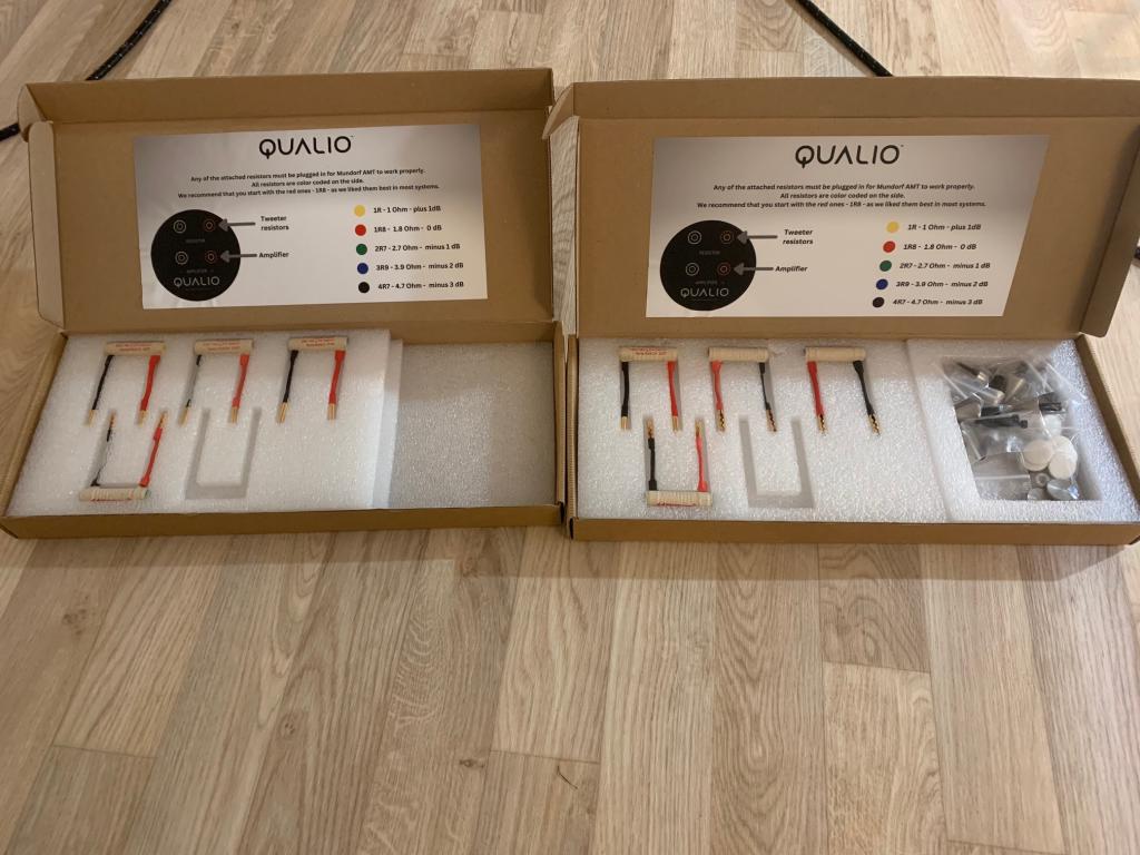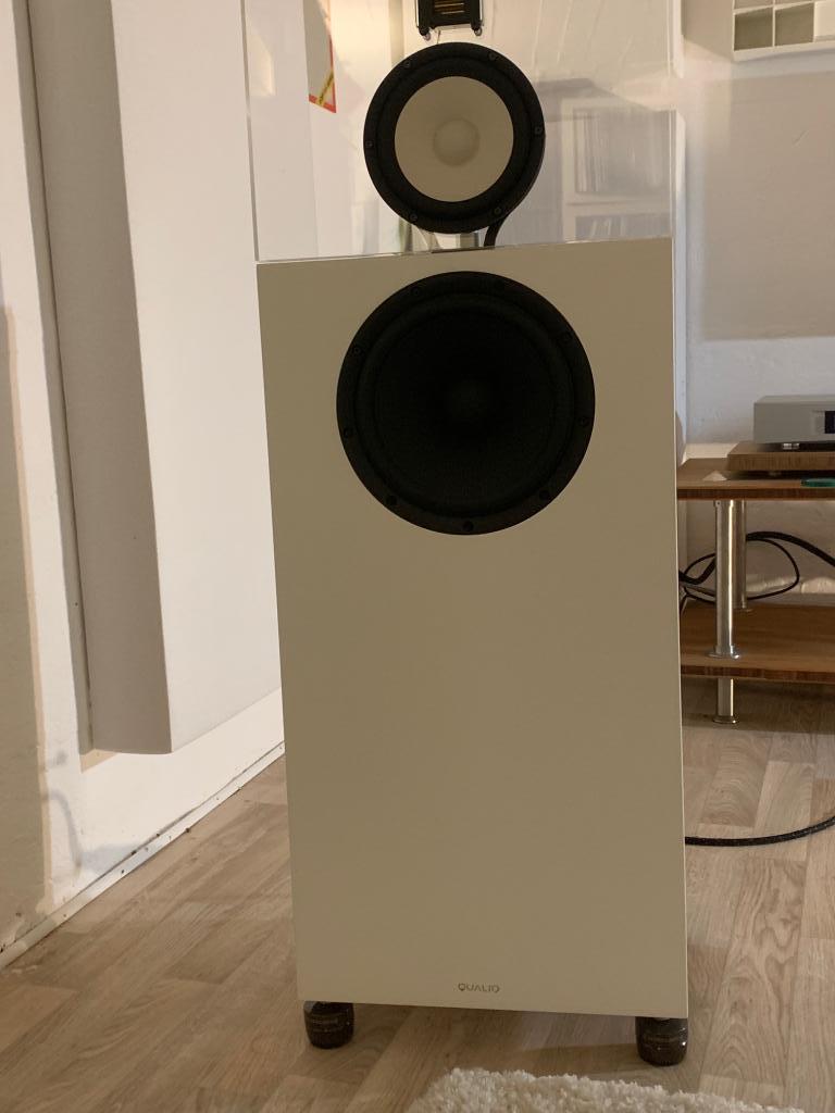 Zu meinem Angebot: Die Qualio ist in der Sonderfarbe Elfenbein lackiert. Der Ton ist aber keinesfalls gelblich, sondern eher ein "nicht knalliges weiß". Ziemlich exakt der Farbton des Mitteltöners. Im Lieferumfang sind die fünf (es gab auch die günstigere Variante mit drei) Mundorf-Widerstände für die Hochtonanpassung. Natürlich die Holzkisten für die sichere Verpackung und die Gaia II Gerätefüße. Als zusätzliches Highlight kann ich zwei zusätzliche Plexiglass-Baffle inkl. Treiber anbieten.