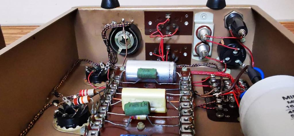 Die Verstärkeranschlüsse sind alle Original, es wurden individuelle Adapter angefertigt für den Betrieb an den heute üblichen Buchsen (Input RCA, Output Banana)