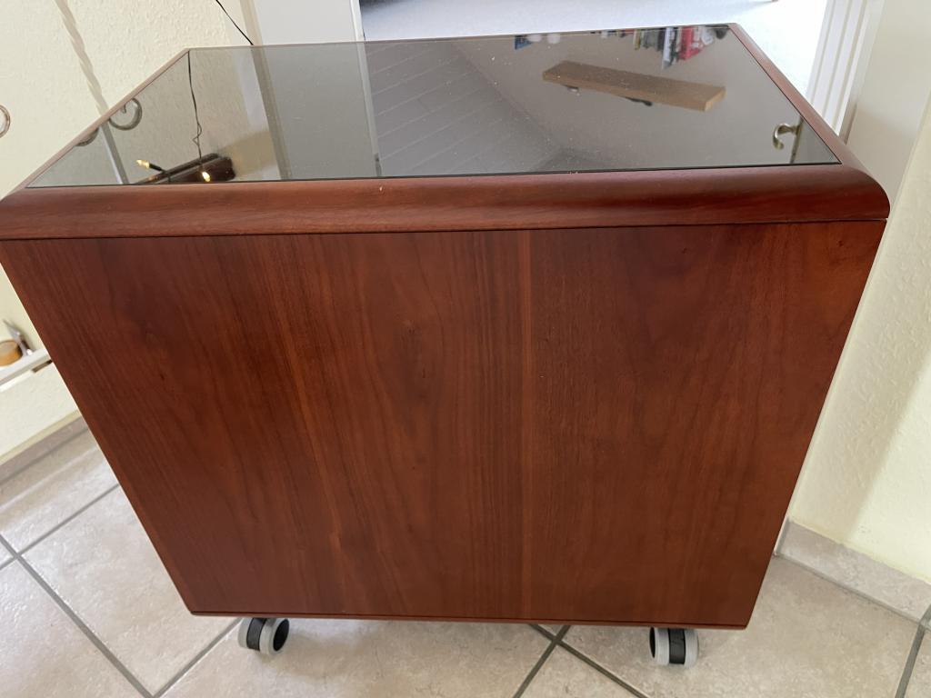 Gehäuse: Massiv, oft mit Glasplatte oben (Gewicht ca. 60 kg / 133 lbs).