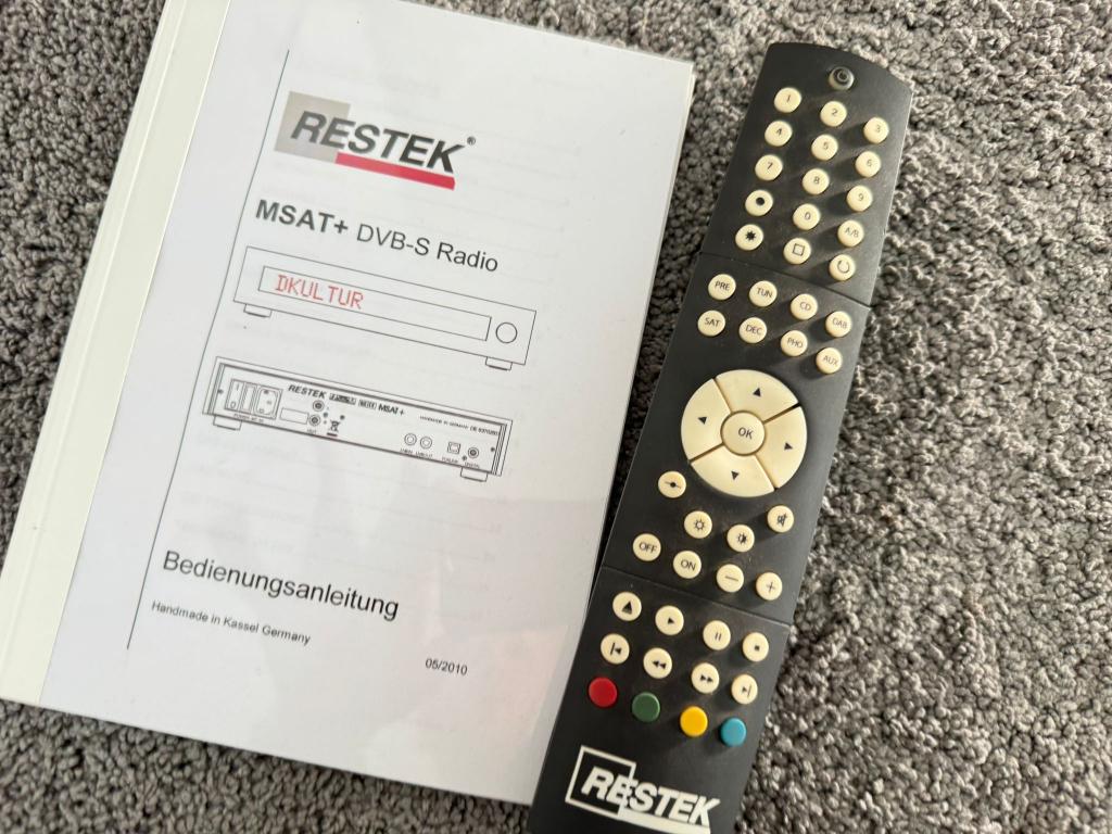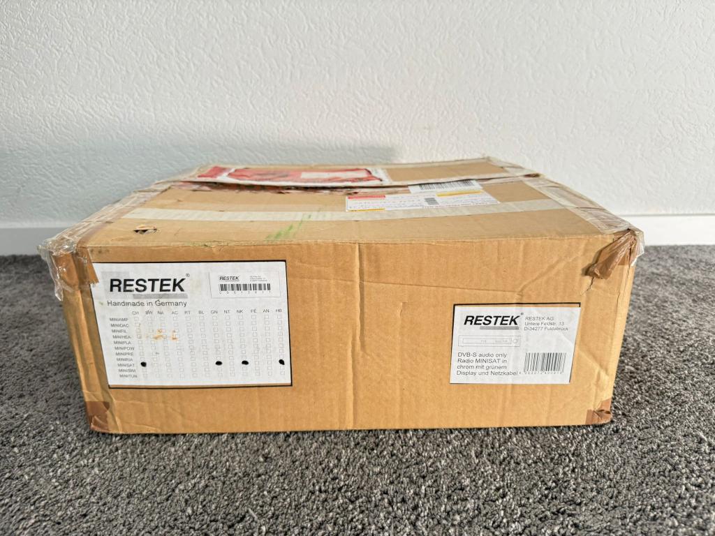 Im Lieferumfang enthalten ist: Restek Minisat, Fernbedienung, Netzkabel, Anleitung und die originale Verpackung.