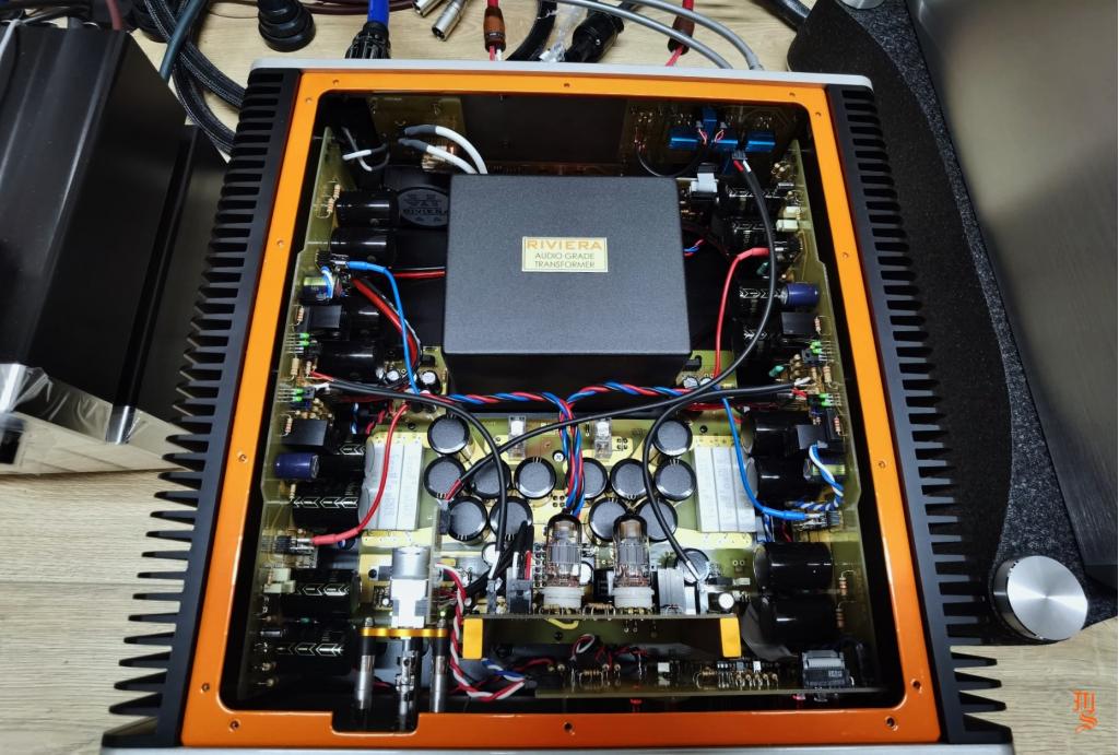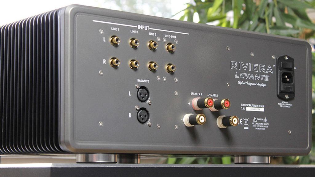 The circuit is built without the use of feedback, and with a very powerful, custom-built power supply. There is switching between class A and A/B directly on the front, and there is a balanced XLR input and 4 unbalanced. One input can be changed to a turntable by purchasing Riviera's separate MM board.