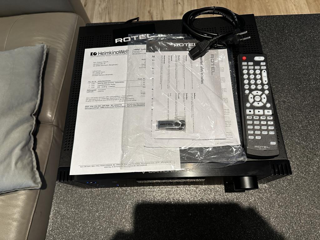 Original Fernbedienung, Rotel USB-Stick, Netzkabel, Dokumente & Originalkarton.