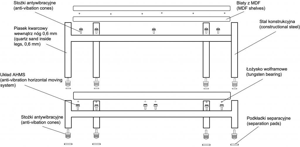 Suspension of shelves: upper level - double shelves , anti-vibration cones and tungsten bearing, bottom level - AHMS (Anti-vibration Horizontal Moving System, consist of three parts: upper grab, down grab and tungsten bearing).