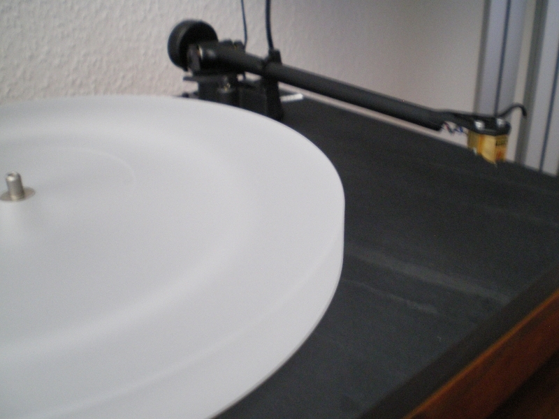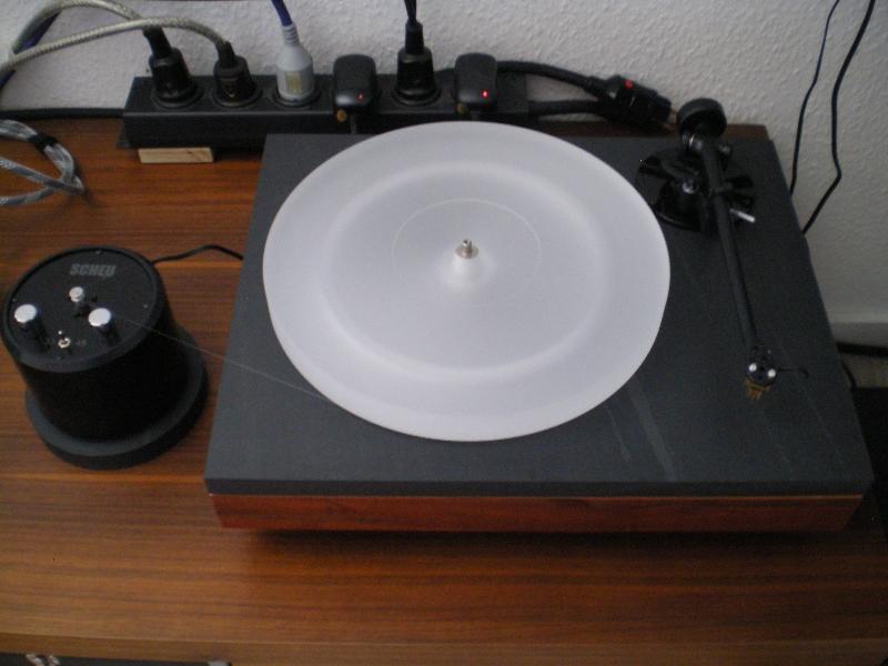 Komplettspieler von Scheu für 9"-Tonarme. Die Zarge besteht aus einem 50mm hohen, resonanzoptimierten und furnierten Schichtaufbau, einer Korkzwischenlage und der 20mm dicken Schieferplatte. Montiert ist ein Rega RB220 Tonarm mit einem Edwards Audio-Gegengewicht mit tieferem Schwerpunkt und Azimutheinstellung (Originalgegengewicht wird mitgeliefert), sowie ein Benz MC Gold Low-Output-System. Der Plattenteller ist aus 27mm starkem, mattiertem Acryl und ca. 2,7kg schwer. Als Antrieb dient ein freistehender Gleichstrommotor mit Drehzahlfeinregulierung für 33 und 45 Umdrehungen. Der ganze Aufbau ruht auf drei Spikefüssen.