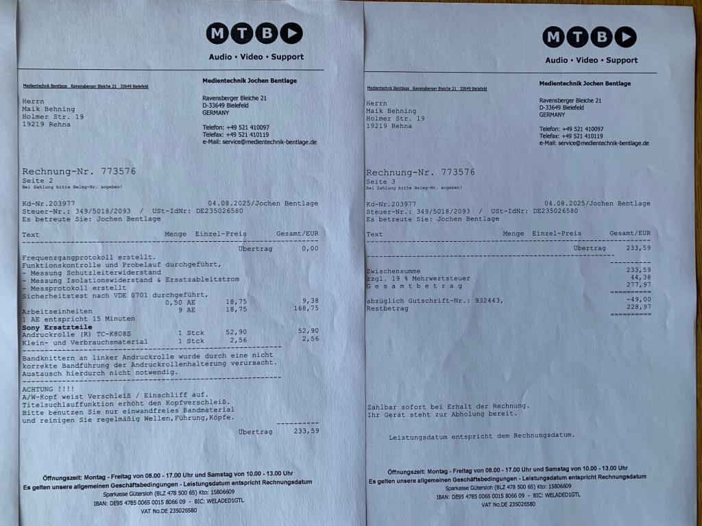 Da ich Privatperson bin, kann ich auf das Gerät keine Garantie geben. Auf die durchgeführten Instandsetzungs- und Erhaltungsarbeiten besteht seitens der Fachwerkstatt jedoch 1 Jahr Gewährleistung. Bei Abholung ist ein Probehören (via Kopfhörer) möglich.