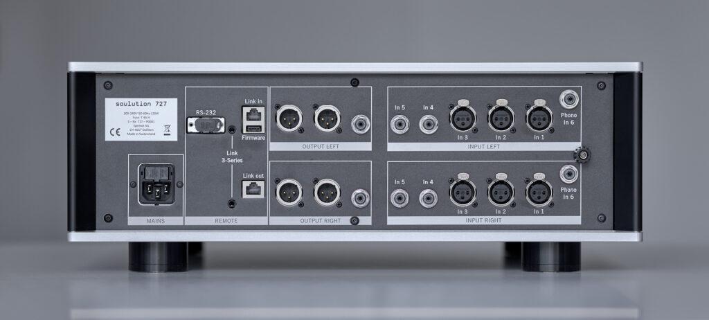 Relais-geschaltete, hochpräzise und extrem rauscharme Metallfolienwiderstände bilden die Lautstärkeregelung mit 80 insgesamt Stufen (1 dB Schritte). Um unangenehme Klick-Geräusche und schädliche Spannungsspitzen während der Lautstärkeanpassung zu verhindern, verfügt der Vorverstärker 727 über eine zweite Lautstärkeregelung, welche den Pegel klickfrei anpassen kann. Diese sekundäre Laustärkeregelung ist nur aktiv, währenddem die Lautstärke angepasst wird. Sobald die neue Lautstärke eingestellt ist, wird wieder auf den Signalpfad mit den hochpräzisen Metallfolienwiderständen umgeschaltet.