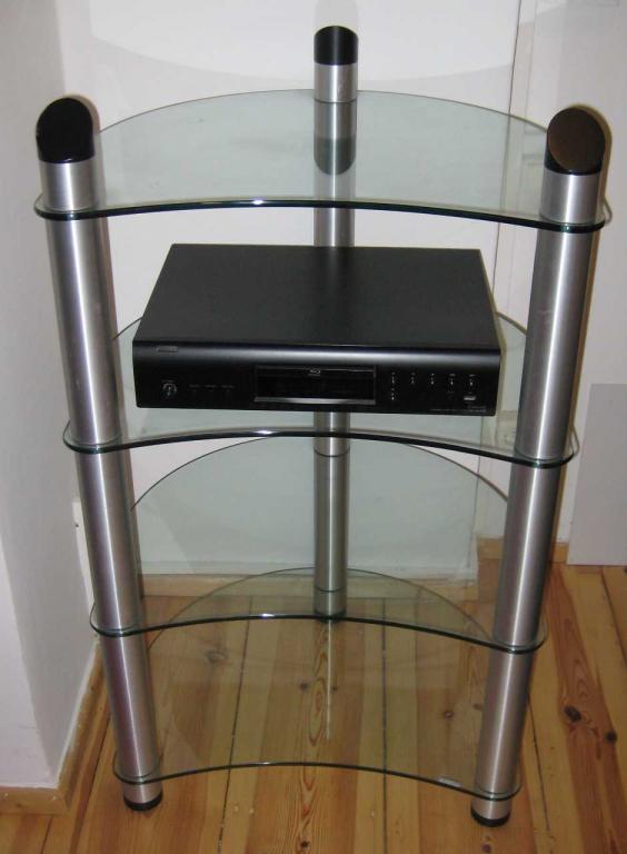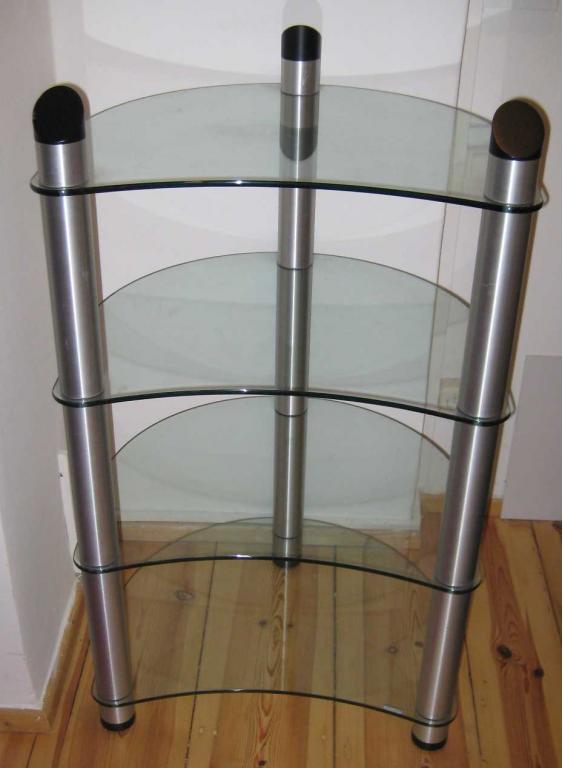 Beliebtes Spectral Audio-Rack mit Alu-Rohren, 4 stabilen Klar-Glas-Ebenen und Kabelkanal.