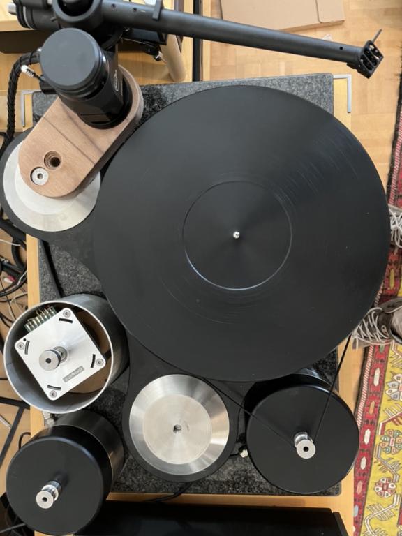 Jedes Laufwerk am Markt hat seine eigene ideale Höhe, in der der Antriebsriemen laufen sollte. Durch die sehr unterschiedlichen Größen und Konzepte der Hersteller ist es mit einer einzelnen Motordose nicht möglich, diese ideale Höhe zu erreichen. Hier greift unser Baukasten-Prinzip: Durch die Kombination aus den beiden Motordosen M-1 und M-6 mit den drei Füßen F-1, F-2 und F-3 (und natürlich der Möglichkeit den Motor ohne Fuß aufzustellen) ergeben sich acht verschiedene Varianten, den Motor aufzubauen. Damit erreichen Sie stufenlos alle Antriebshöhen von 95mm bis etwa 180mm. Zusätzlich verfügt natürlich jede Variante über austauschbare, variable Spikes. Über diese wird der Antrieb nivelliert, kann aber auch noch um einige Millimeter in der Höhe feinjustiert werden.