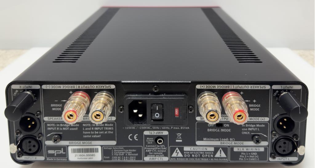Die Endstufe kann über ein Klinkenkabel vom SPL Vorverstärker aus eingeschaltet werden, verfügt aber auch hinten über einen Netzschalter um sie komplett abzuschalten.
