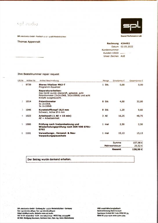 Dieses Gerät wurde im Sommer 2022 bei SPL komplett durchgecheckt, mit acht neuen Potentiometern ausgestattet und seit dem nicht mehr benutzt.