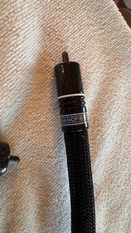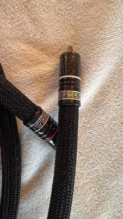 Die neueste Version der Nanofiber ist oben dargestellt. Es verfügt über kundenspe-zifische STEALTH-Cinch- und XLR-Anschlüsse mit maschinell bearbeiteten Echt-kohlefasergehäusen, massiven Silberkontakten für Abschirmung/Rückleitung und massiven Cinch-Cinch-Mittelstiften sowie signalführenden XLR-Stiften aus massi-ver Kohlefaser und Teflon-Dielektrikum.