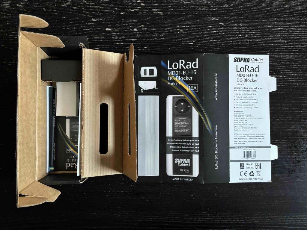 LoRad MD01-16EU DC-Blocker Mark 3.1 von Supra Cables. Guter Zustand mit leichten Gebrauchsspuren, der eine Gummifuß hat sich leicht gelöst/verschoben (siehe Bild). Originalverpackung.