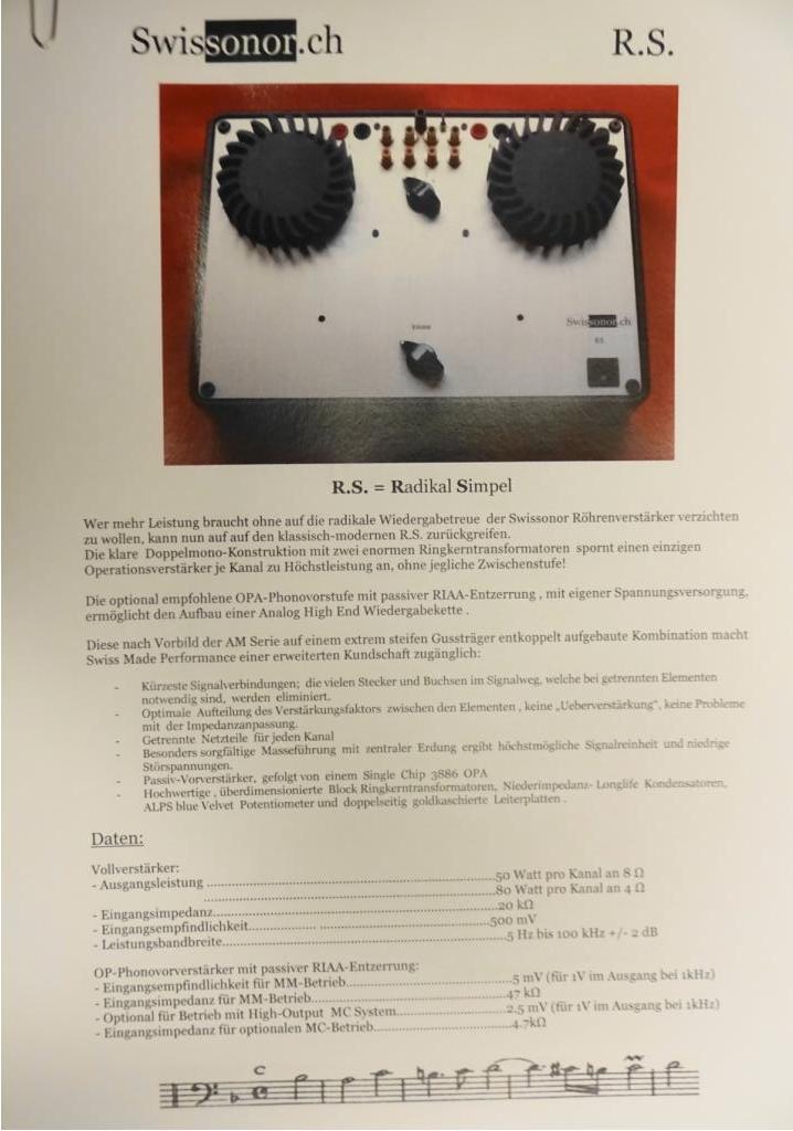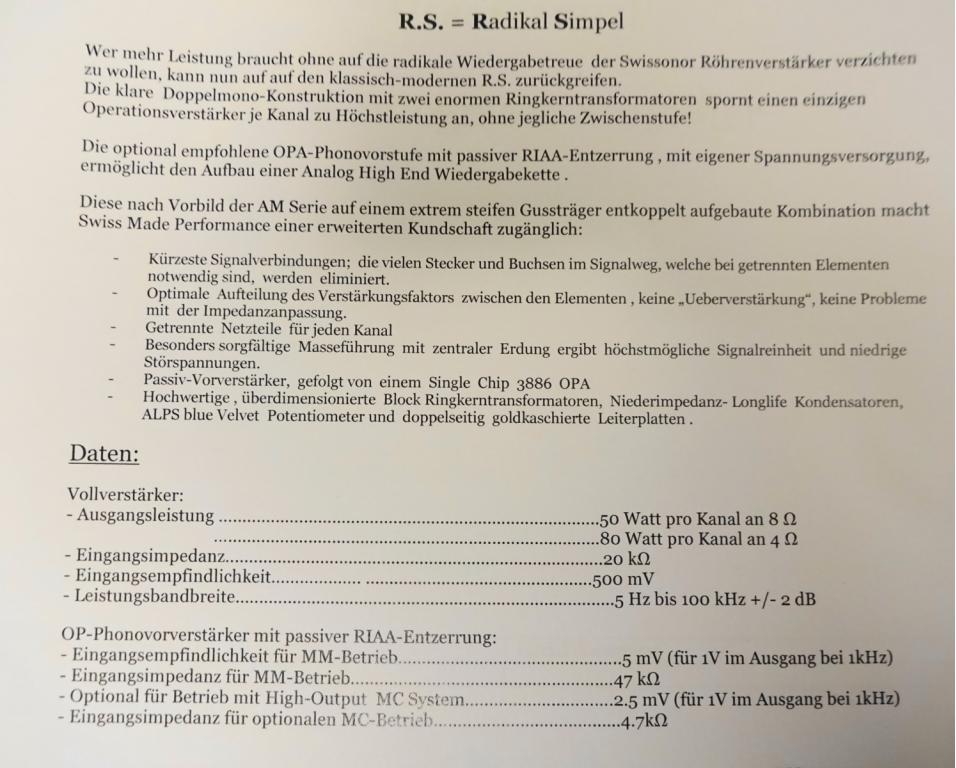 Der angebotene Transistor - Vollverstärker R.S. (Radikal Simpel) mit eingebautem MM - Phonovorverstärker von der Schweizer Manufaktur Swissonor befindet sich im neuwertigen Zustand. Es wurde nur ein Funktionstest durchgeführt.