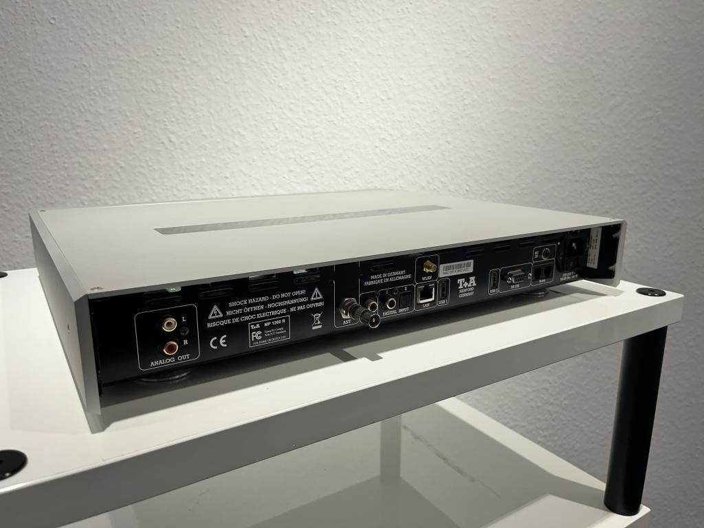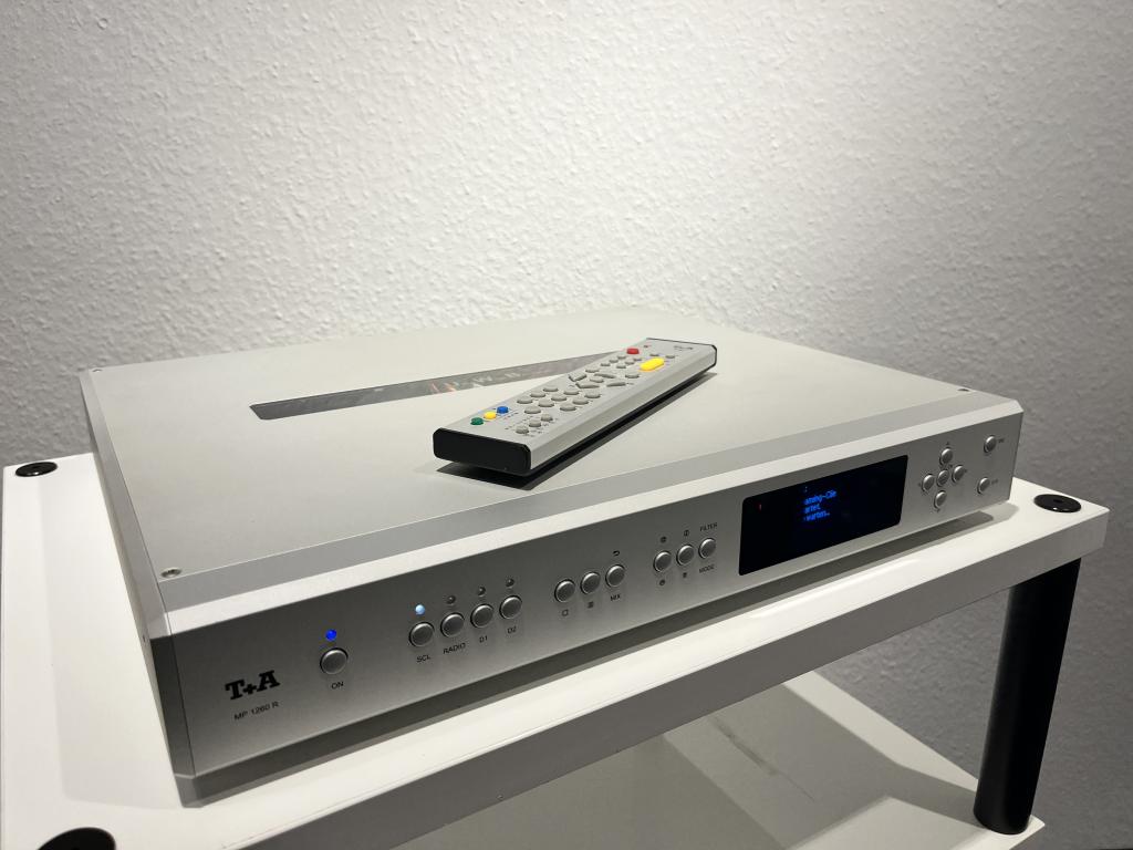 "Der MP 1260 R präsentiert sich für diese höheren Aufgaben bestens ausgestattet, enthält neben Resonanzoptimierungsmaßnahmen aufwändige, für Steuer-, Analog- und Digitalsektionen separat ausgeführte Stromversorgungskreise und hochwertige, diskret aufgebaute analoge Ausgangsstufen. Die klanglich wichtigste Neuerung gegenüber dem Vorgänger MP 1250 R steckt im D-A-Wandlertrakt: Dieser ist nach wie vor mit vier Wandlern bestückt, die im Doppel-Differential-Modus arbeiten, erstmalig kommen hier allerdings neueste 32-Bit-Wandler von Texas Instruments zum Einsatz. Bei diesen PCM 1795 handelt es sich, wie die Typbezeichnung Kenner vermuten lässt, um die Nachfolger der vorher eingesetzten Chips vom Spezialisten Burr Brown, der inzwischen von Texas Instruments übernommen wurde. Für das 8-fache Oversampling setzt T+A bewährte, sehr leistungsfähige 56-Bit-DSP-Technik ein und lässt Kunden die Wahl zwischen vier Filern, die klangliche Tendenzen von ultradynamisch (impulsoptimiertes FIR) bis „analog weich“ (Bezier) sowie eine gelungene Kombination dieser konträren Algorithmen (Bezier/IIR) abdecken. "