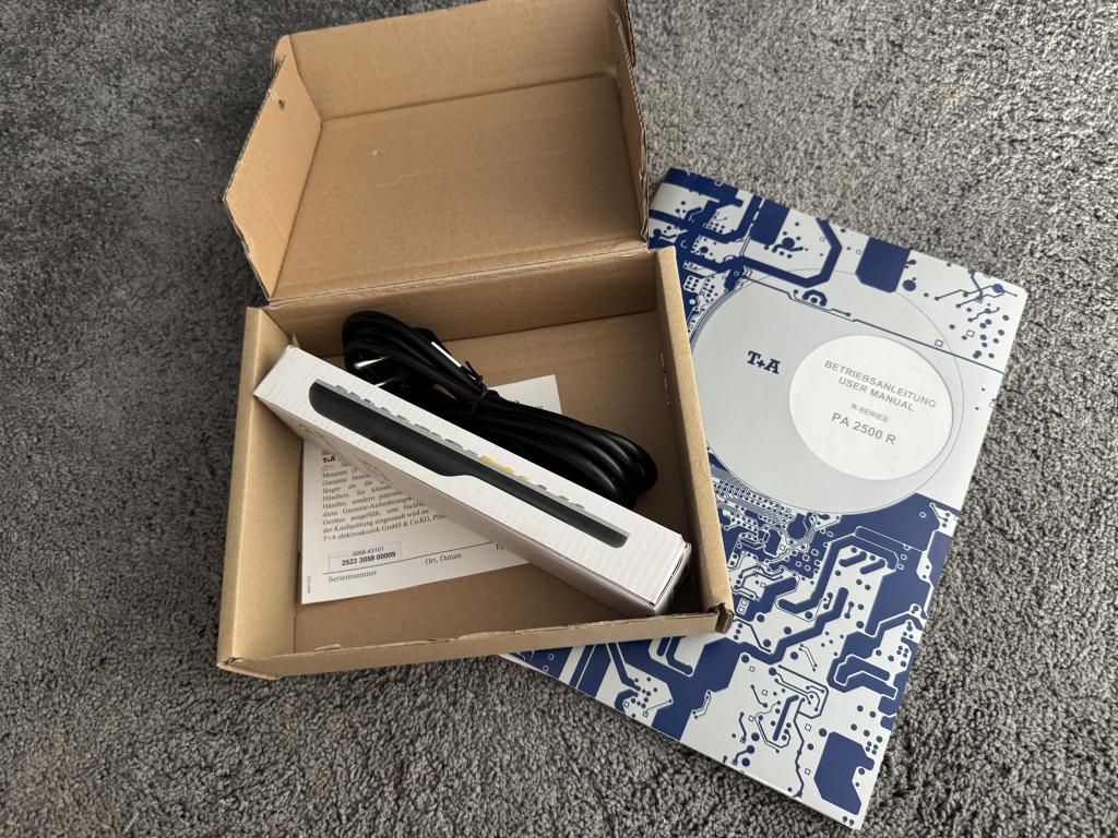 Im Lieferumfang enthalten ist: T+A PA 2500 R, Netzkabel, Fernbedienung und die originale Verpackung.
